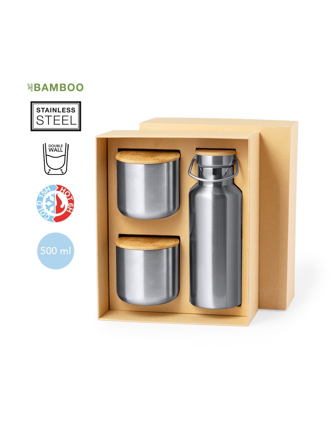 Práctico set de bidón y vasos térmicos en acero inox. Incluye bidón térmico de 500 ml de capacidad fabricado en acero inox con detalle superior de bambú y asa. Además, contiene 2 vasos de 300 ml de capacidad cada uno fabricados acero inox y tapaderas fabricadas bambú con cierre de presión. Presentado en una caja troquelada de diseño kraft.