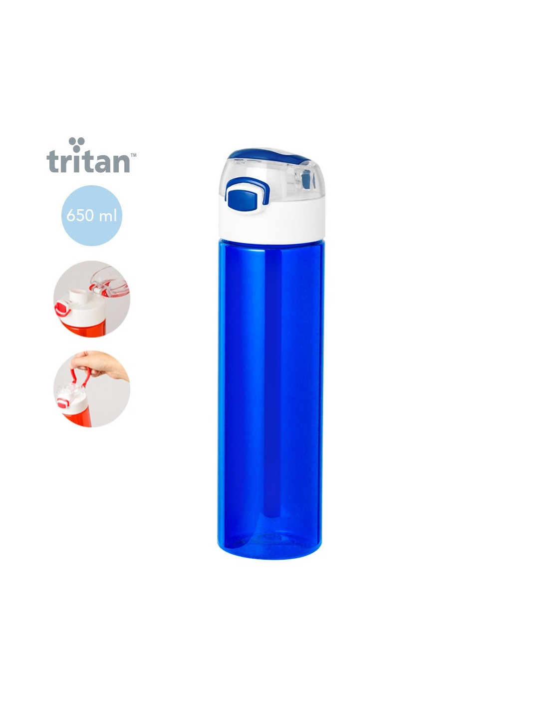 Bidón fabricado en Tritan de 650 ml de capacidad. Ingeniosa tapadera con resorte de fácil apertura pulsando el botón frontal, con cierre de seguridad. Sellado óptimo de tapón a rosca y asa para un cómodo transporte. Disponible en variada gama de colores y presentado en una caja individual de diseño kraft.