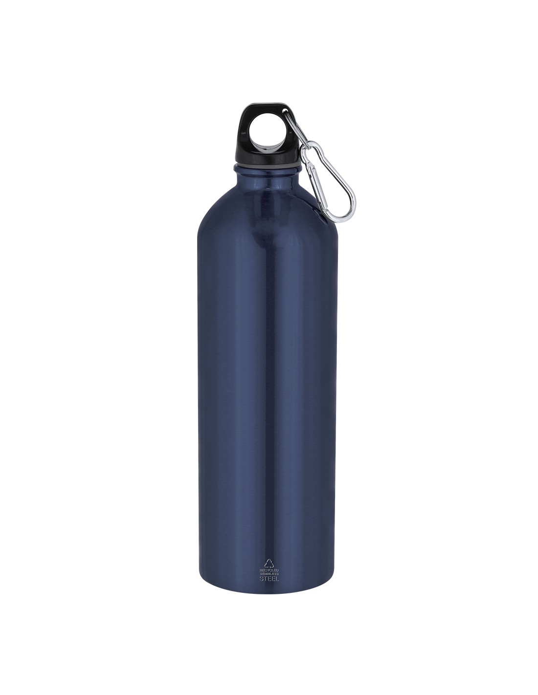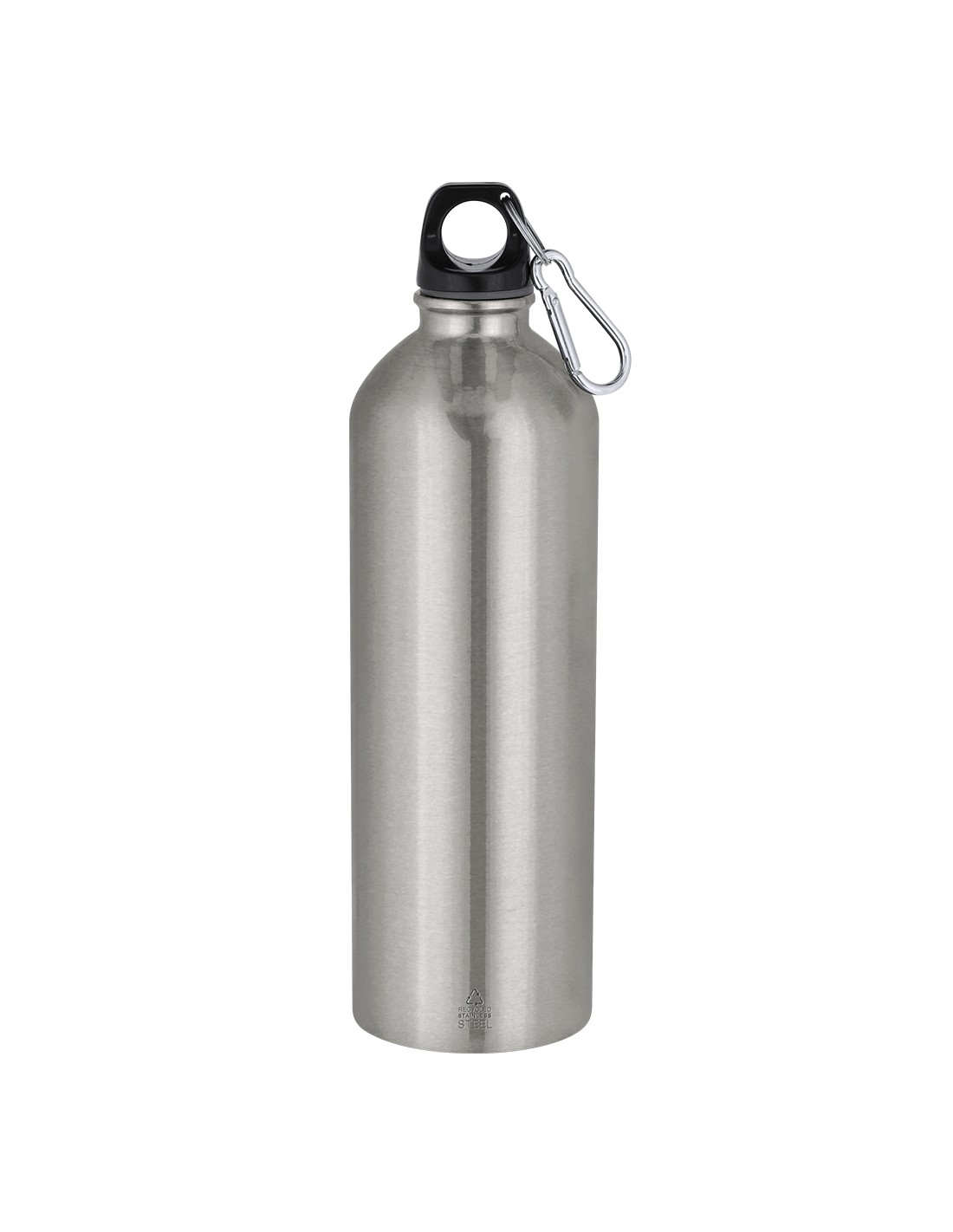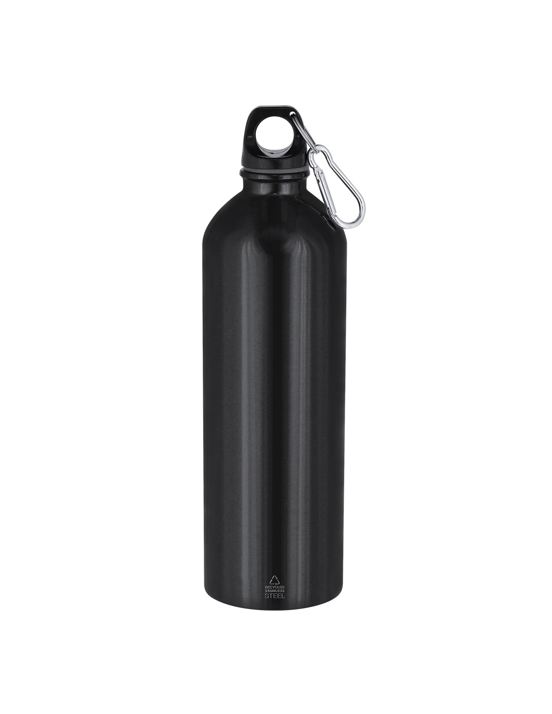 Bidón con 800 ml de capacidad. Fabricado en Acero Inoxidable Reciclado con acabado metalizado. Tapón negro de cierre a rosca para garantizar un sellado óptimo. Incluye mosquetón metálico que facilita su transporte. Con distintivo Acero Inoxidable Reciclado. El acero es uno de los materiales más demandados y que puede encontrarse casi en todas partes, desde productos de uso diario a grandes construcciones. Con innumerables propiedades, entre las que cabe destacar la durabilidad y su alto grado de reutilización, convirtiéndolo en una alternativa muy valorada en soluciones de sostenibilidad. Debidamente tratado, permite obtener nuevos recursos de infinita utilización.