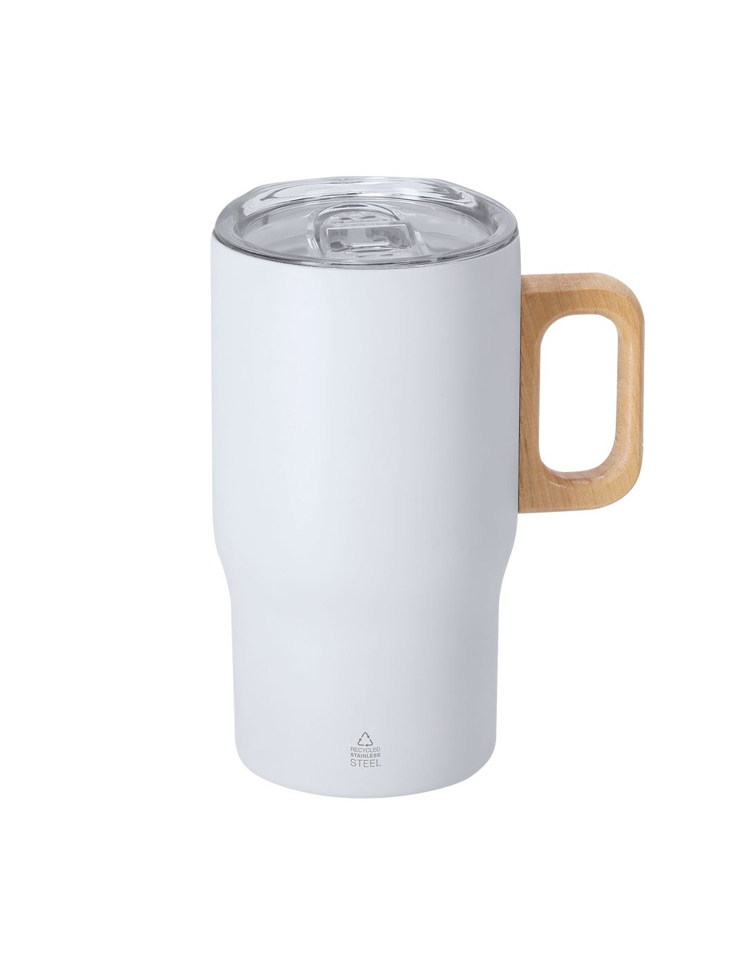 Taza térmica en Acero Inox Reciclado de doble pared con 400 ml de capacidad y asa rígida de madera para mayor comodidad. Exterior en acabado biselado mate. Incluye tapadera con sistema de cierre a presión transparente y dosificador de fácil apertura abatible, libre de BPA. Es ideal para tener en tu escritorio, mesa o en cualquier superficie donde disfrutar tranquilamente de tu bebida favorita. Incluye distintivo de Acero Inox Reciclado.