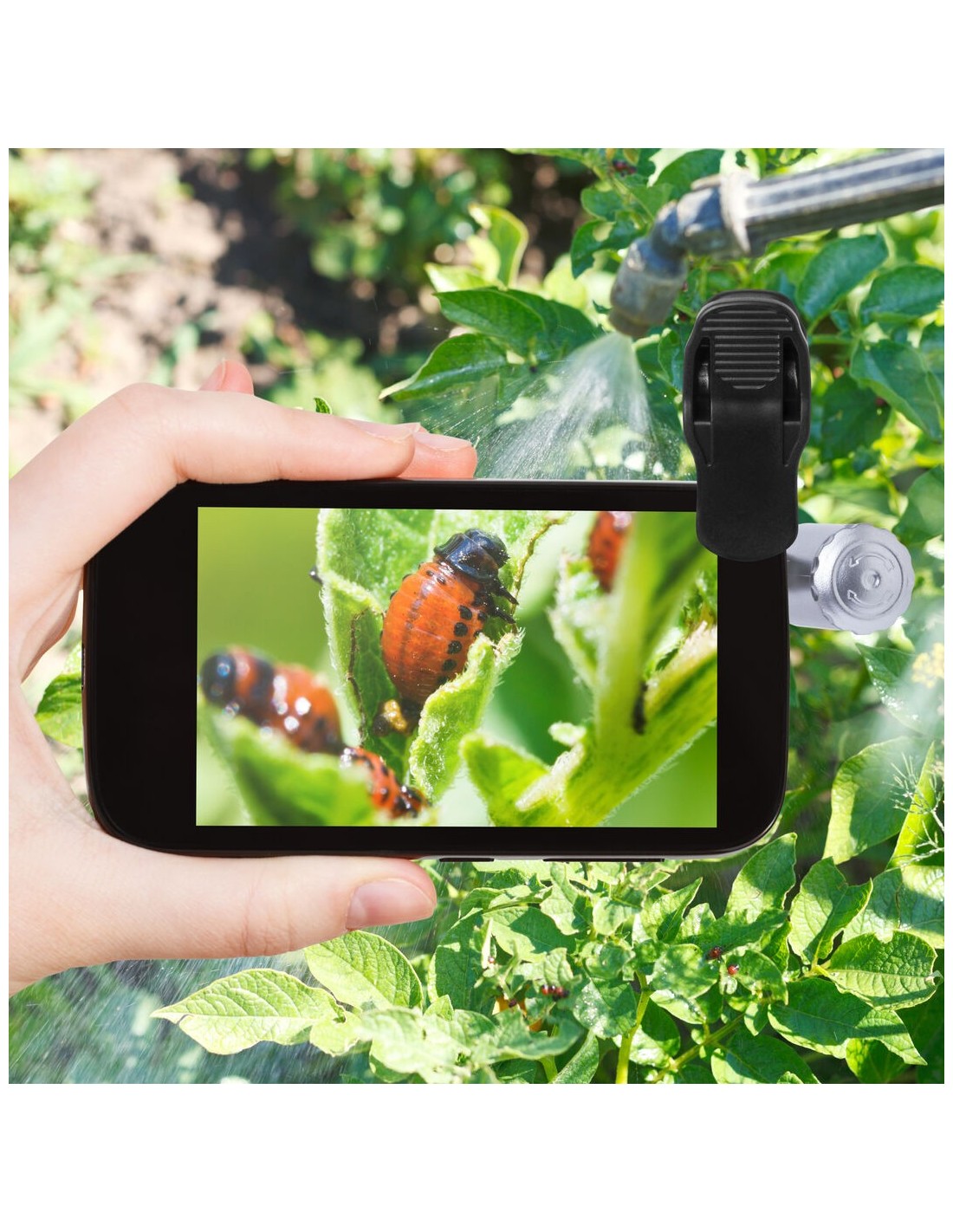 Microscopio para smartphone ajustable a la cámara mediante pinza. Con lentes de aumento de cristal de hasta 60x, 2 ledes y luz ultravioleta para una experiencia de aumento completa. Pilas de botón incluidas. Presentado en una elegante funda de polipiel y