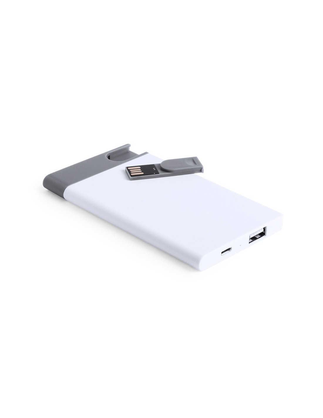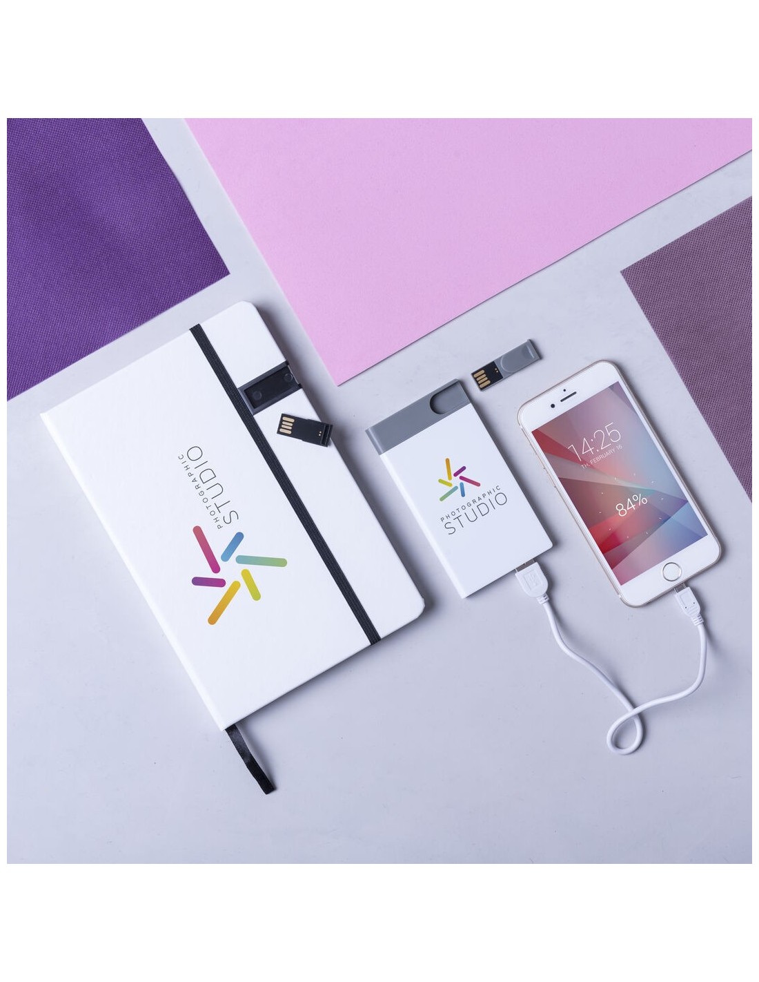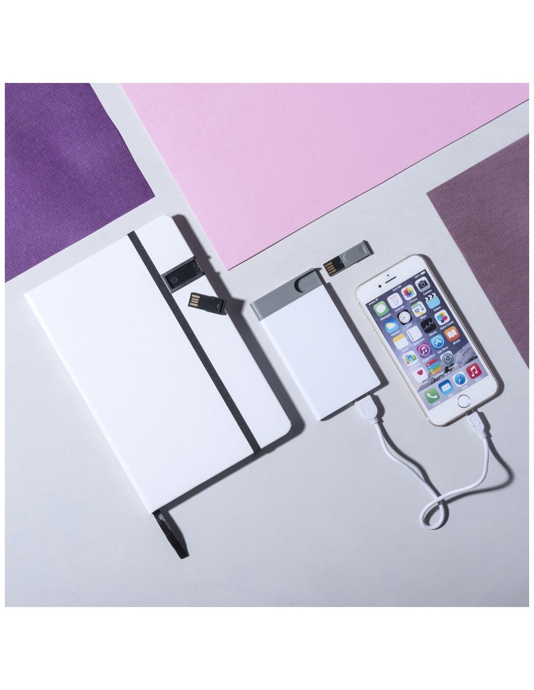 Batería auxiliar externa ultraplana de 2.500 mAh de capacidad de carga con memoria USB extraíble de 8 GB de capacidad y cable micro USB incluido. Amplia superficie de marcaje, especialmente recomendada para tampografía y marcaje digital, todo ello present