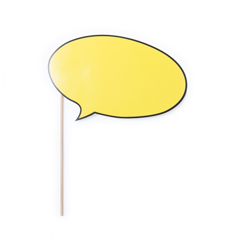 Selfie bocadillo en llamativo color amarillo con amplia superficie de impresión. En papel de alto gramaje con mango de madera.