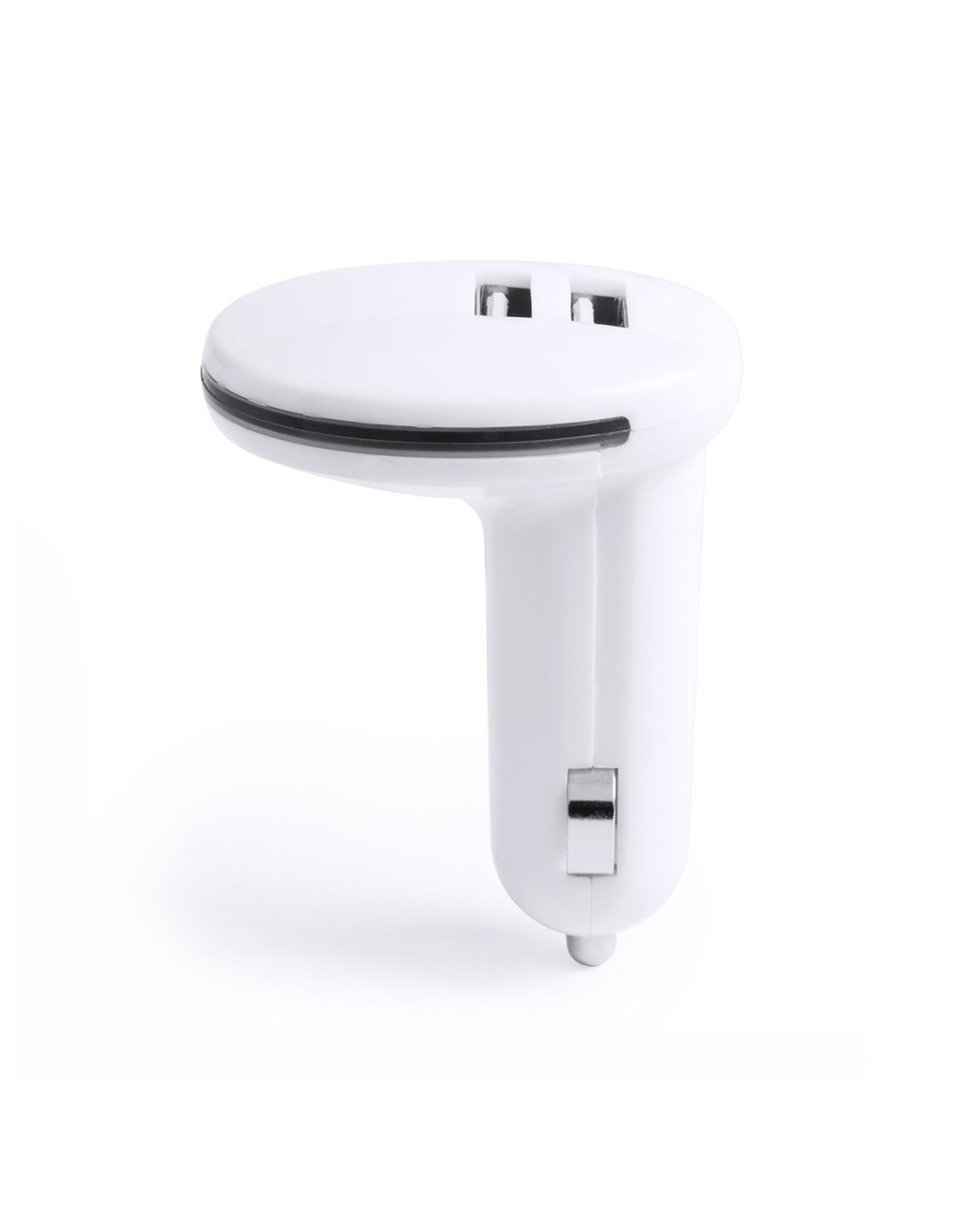 Cargador USB de para mechero de coche de 2.100 mAh de capacidad de carga en diseño minimalista de color blanco. Con salida USB dual que permite la carga simultánea de dos dispositivos móviles. Presentado en caja individual.