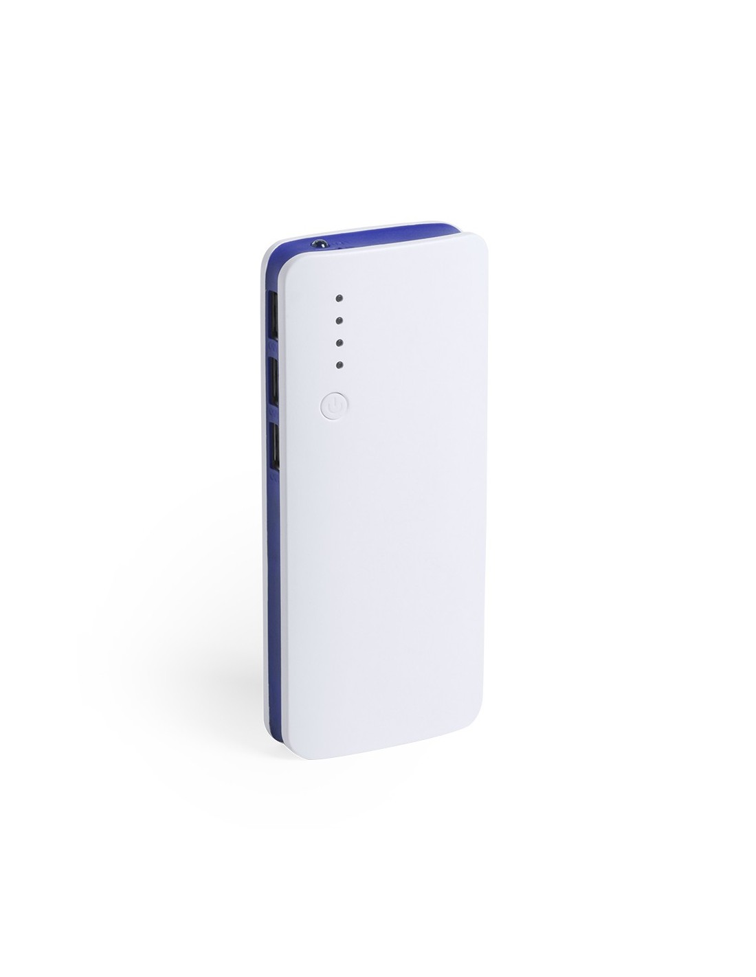 Batería auxiliar externa de gran capacidad de carga -10.000 mAh-. Con salida USB triple para cargar hasta 3 dispositivos de forma simultánea, ledes indicadores de estado de carga, diseño curvado con cuerpo en color blanco y laterales en vivos colores, con