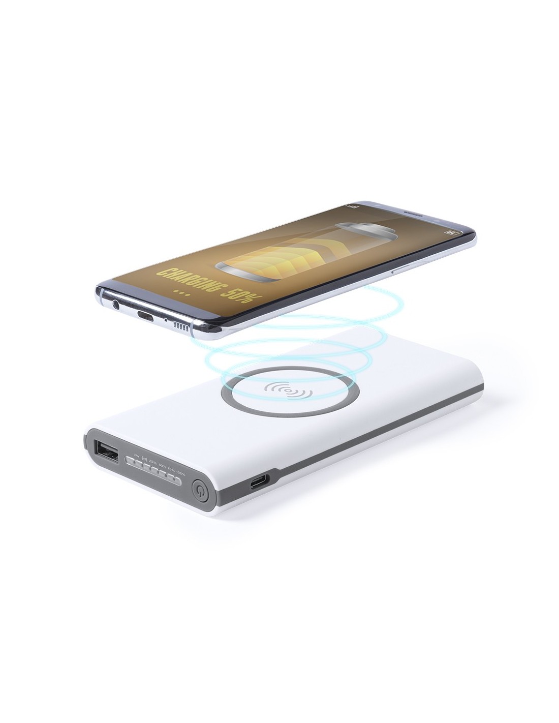 Batería auxiliar externa con tecnología de carga inalámbrica de gran capacidad -6.000 mAh-. Conexión tipo C de entrada/salida de corriente y micro USB de entrada. Con ledes indicadores de estado de carga y amplia superficie de marcaje. Presentada en atrac