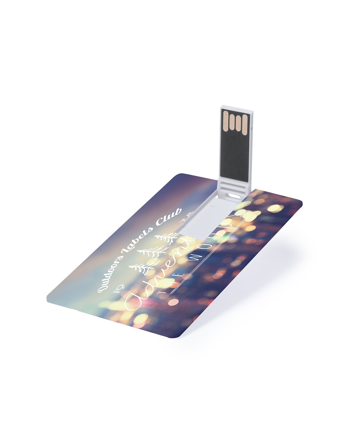 Memoria USB tarjeta de 16GB de capacidad. De diseño ultraplano, mecanismo plegable y especialmente diseñada para marcaje a todo color en digital. Presentada en elegante funda individual de polipiel blanca.