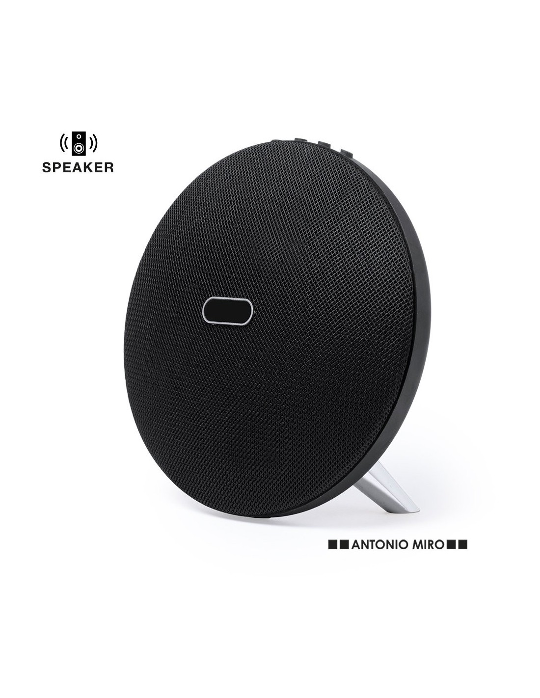 Altavoz de conexión bluetooth en elegante acabado de color negro con accesorioss en plateado y original diseño circular. Ofrece 8W de potencia, tiene función de manos libres, una ranura para tarjetas micro SD de hasta 32 GB de capacidad y entrada auxiliar