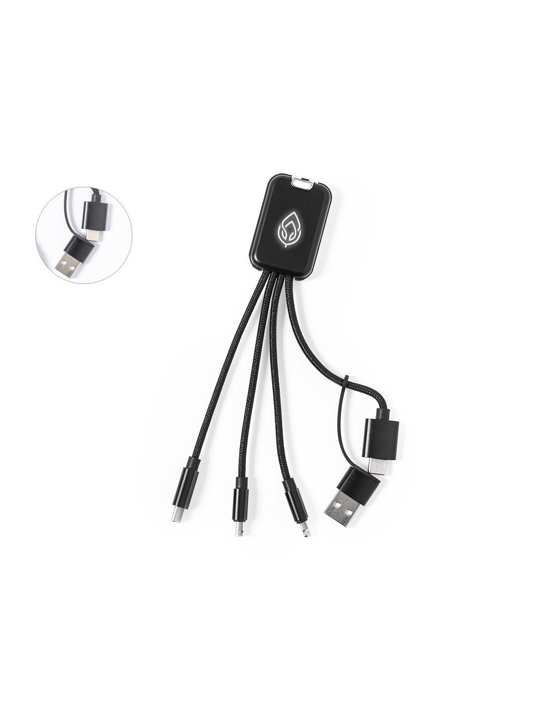 Cable cargador con luz, con pieza central especialmente diseñada para marcaje en láser e iluminar el logotipo. Con conexiones de entrada Tipo C y USB; y salidas Tipo C, Lightning y Micro USB. 5V DC 2.4A. En elegante acabado de color negro, con cables recubiertos en tela de poliéster.