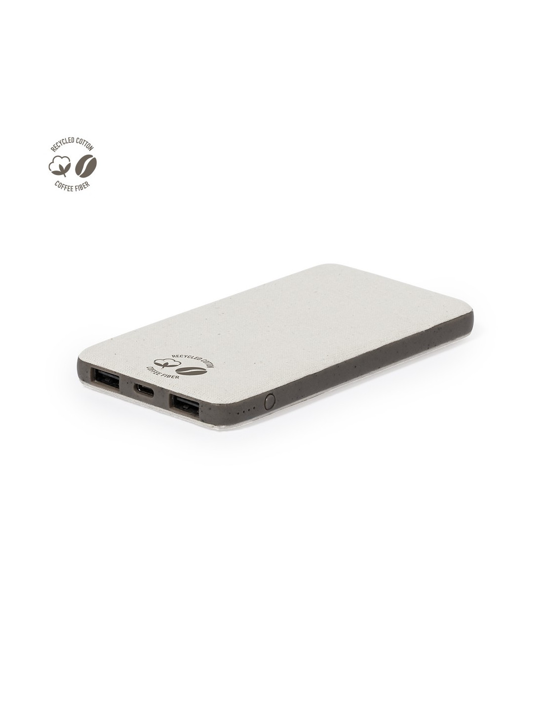 Batería auxiliar externa de 5.000 mAh, fabricada en fibra de café y algodón reciclado. Con 2 salidas USB, entrada micro USB y conexión dual de entrada y salida Tipo C. Cable de carga Tipo C incluido, y presentada en caja individual de diseño kraft. Con distintivos de fibra de café y algodón reciclado. Disponible manual de instrucciones en español e inglés. La fibra de café es una solución circular que se obtiene de la utilización de los residuos producidos en la obtención del café. Una alternativa sostenible que favorece la reducción del uso de plásticos, ahorrando energía en su proceso de fabricación y contribuyendo al cuidado del medio ambiente. Entrada/Salida USB C: 5V DC 2.4V Salida USB: 5V DC 2.4A Entrada Micro USB: 5V DC 2.1A Las capacidades mostradas en todas nuestras baterías auxiliares externas son reales, incorporando todas ellas baterías de grado A y no recicladas, con una vida útil de al menos 500 ciclos de carga y según normativa CE. Además, están fabricadas conforme a los estándares RoHS y en cumplimiento con los siguientes requisitos de seguridad: Sistema de protección contra sobrecarga del power bank. Sistema de protección contra descarga completa que proporciona una mayor durabilidad del power bank. Sistema de bloqueo para evitar cortocircuitos. Sistema de transferencia de carga constante, acorde con la capacidad del dispositivo de destino. Disponible certificación GRS (Global Recycled Standard / Estándar de Reciclaje Global), que garantiza el origen reciclado del material usado para fabricar el producto.