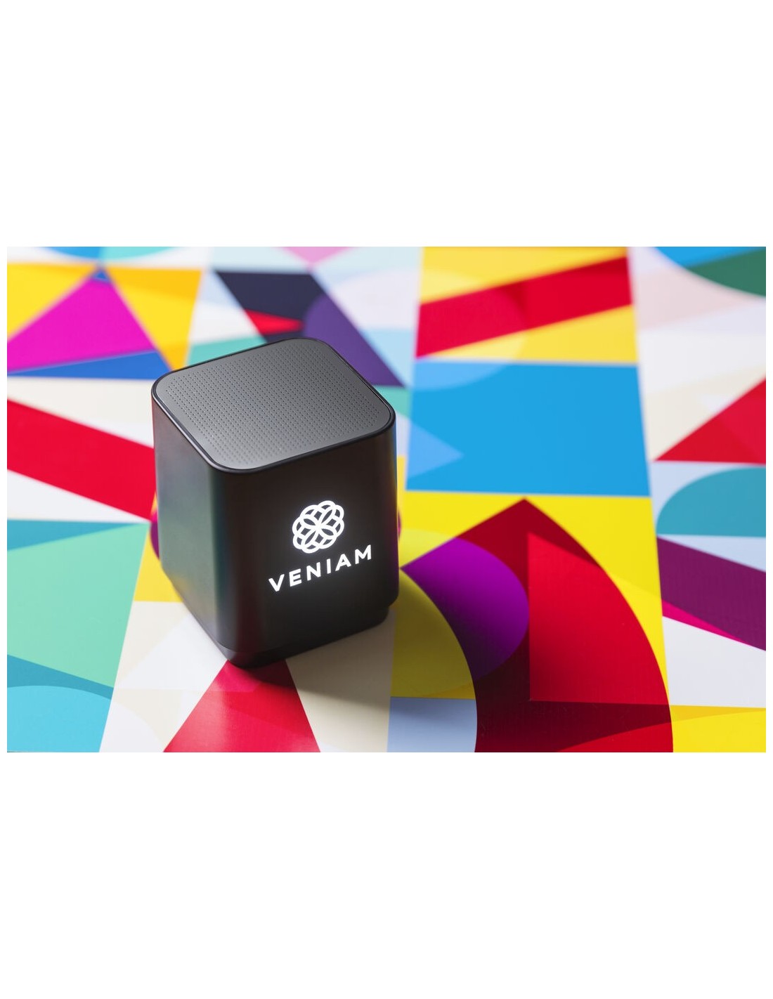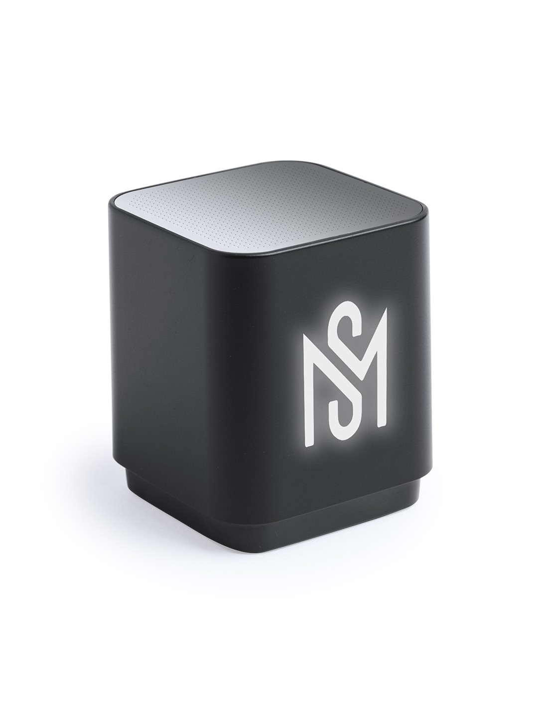 Altavoz con conexión Bluetooth®, luz led interior y cuerpo especialmente diseñado para marcaje en láser, iluminando así el logotipo. Con 3W de potencia y función manos libres. Recargable mediante cable USB -incluido- y presentado en una atractiva caja de diseño.