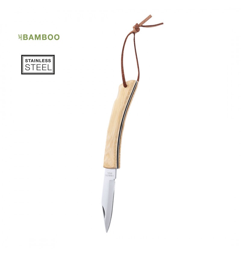 Navaja de línea nature con hoja de acero inox y resistente empuñadura de bambú con bloqueo de seguridad. Con cinta para transporte en polipiel y presentada en caja individual.