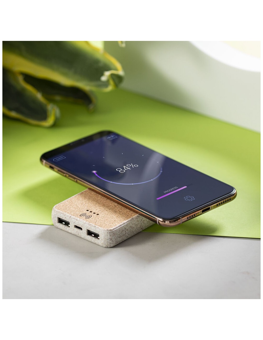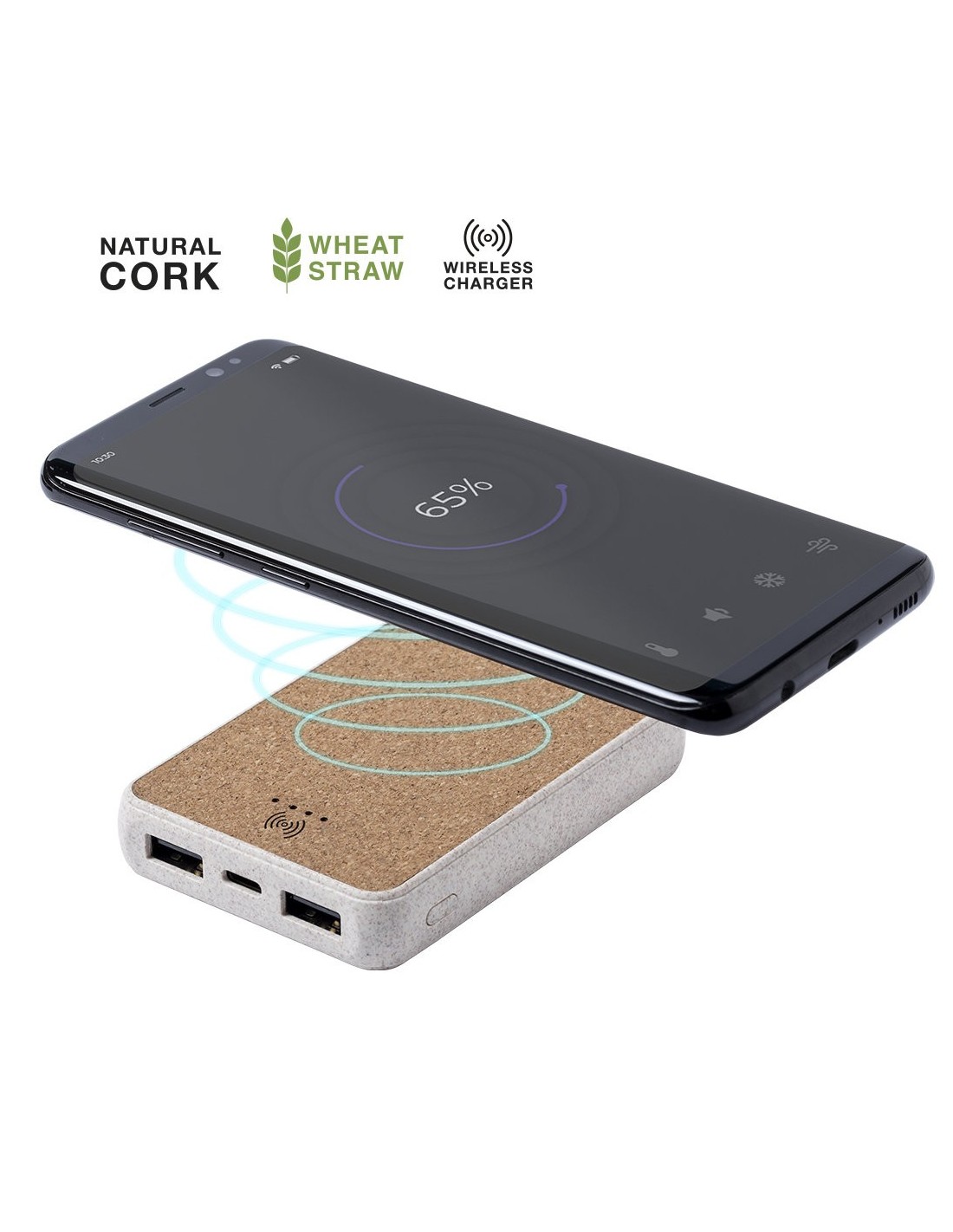 Batería auxiliar externa de línea nature con cargador inalámbrico 5W integrado. Carcasa en combinación de materiales corcho natural y caña de trigo. 5.000 mAh de capacidad e indicador de estado de carga. Doble salida USB y entrada Tipo C. Con amplia superficie de marcaje y presentado en atractiva caja de diseño eco. Las capacidades mostradas en todas nuestras baterías auxiliares externas son reales, incorporando todas ellas baterías de grado A y no recicladas, con una vida útil de al menos 500 ciclos de carga y según normativa CE. Además, están fabricadas conforme a los estándares RoHS y en cumplimiento con los siguientes requisitos de seguridad: Sistema de protección contra sobrecarga del power bank. Sistema de protección contra descarga completa que proporciona una mayor durabilidad del power bank. Sistema de bloqueo para evitar cortocircuitos. Sistema de transferencia de carga constante, acorde con la capacidad del dispositivo de destino.