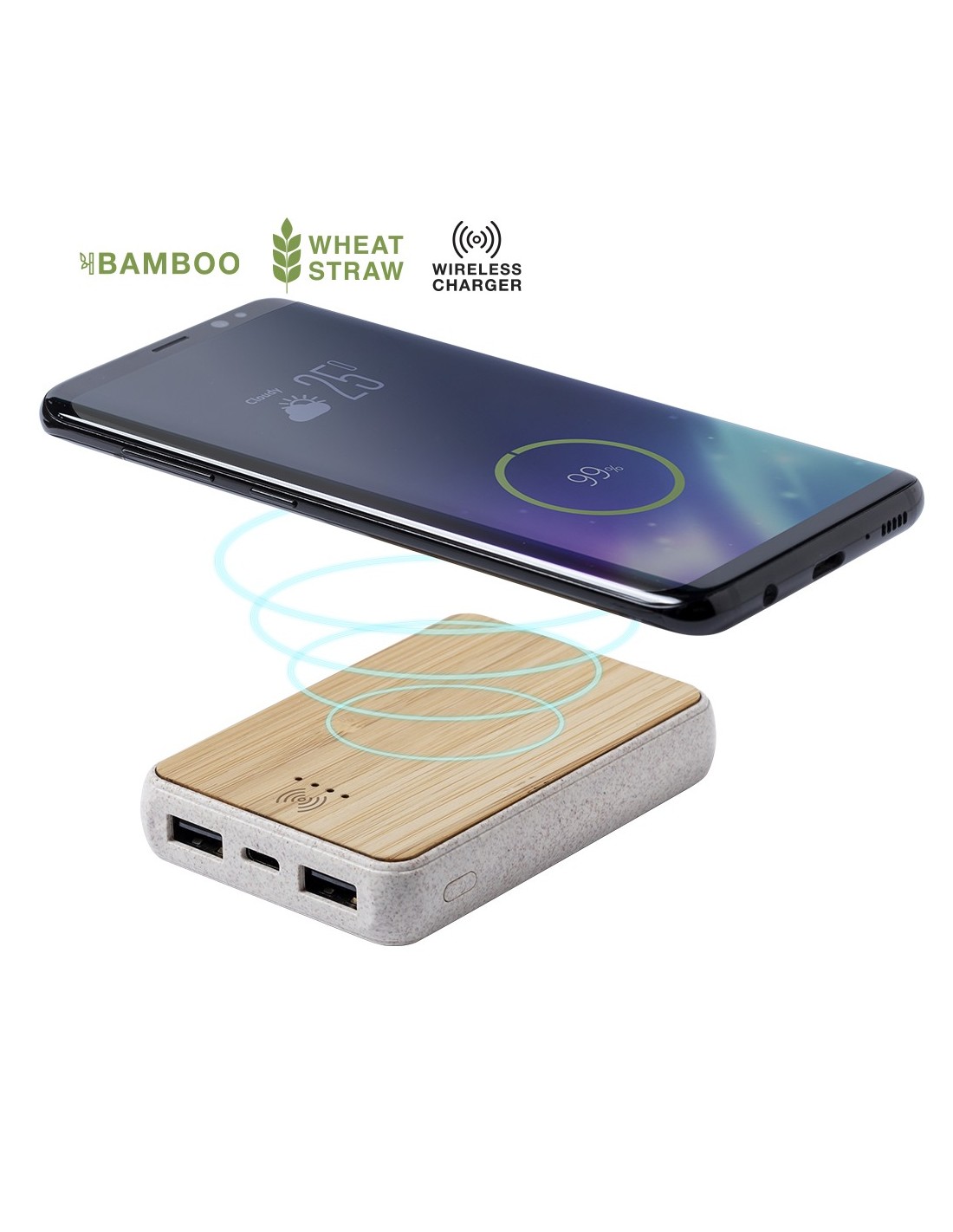Batería auxiliar externa de línea nature con cargador inalámbrico 5W integrado. Carcasa en combinación de materiales bambú y caña de trigo. 5.000 mAh de capacidad e indicador de estado de carga. Doble salida USB y entrada Tipo C. Con amplia superficie de marcaje y presentado en atractiva caja de diseño eco. Las capacidades mostradas en todas nuestras baterías auxiliares externas son reales, incorporando todas ellas baterías de grado A y no recicladas, con una vida útil de al menos 500 ciclos de carga y según normativa CE. Además, están fabricadas conforme a los estándares RoHS y en cumplimiento con los siguientes requisitos de seguridad: Sistema de protección contra sobrecarga del power bank. Sistema de protección contra descarga completa que proporciona una mayor durabilidad del power bank. Sistema de bloqueo para evitar cortocircuitos. Sistema de transferencia de carga constante, acorde con la capacidad del dispositivo de destino.