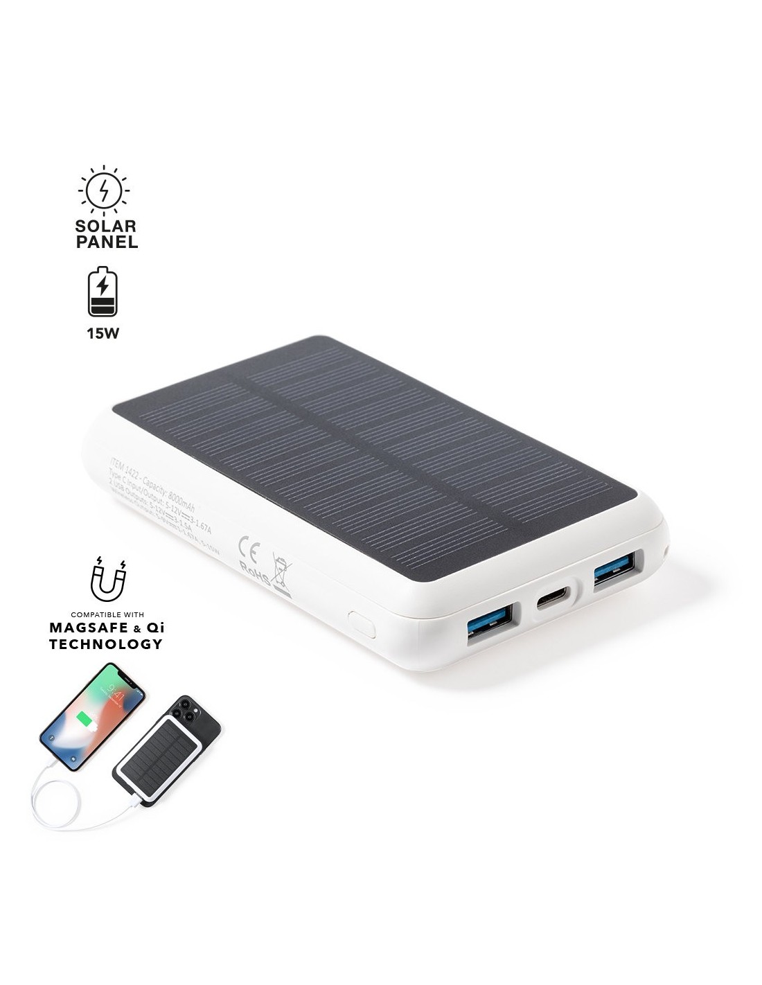 Batería auxiliar externa de recarga solar y de gran capacidad de carga -8.000 mAh-. Con cargador inalámbrico integrado 15W y fijación magnética para poder usar el dispositivo mientras se está cargando. En resistente ABS, con conector de entrada y salida Tipo C + 2 salidas USB. Incluye anillo adhesivo, siendo válido para todos los dispositivos con tecnología Magsafe y Qi. Presentada en atractiva caja individual de diseño.Las capacidades mostradas en todas nuestras baterías auxiliares externas son reales, incorporando todas ellas baterías de grado A y no recicladas, con una vida útil de al menos 500 ciclos de carga y según normativa CE. Además, están fabricadas conforme a los estándares RoHS y en cumplimiento con los siguientes requisitos de seguridad: Sistema de protección contra sobrecarga del power bank. Sistema de protección contra descarga completa que proporciona una mayor durabilidad del power bank. Sistema de bloqueo para evitar cortocircuitos. Sistema de transferencia de carga constante, acorde con la capacidad del dispositivo de destino.