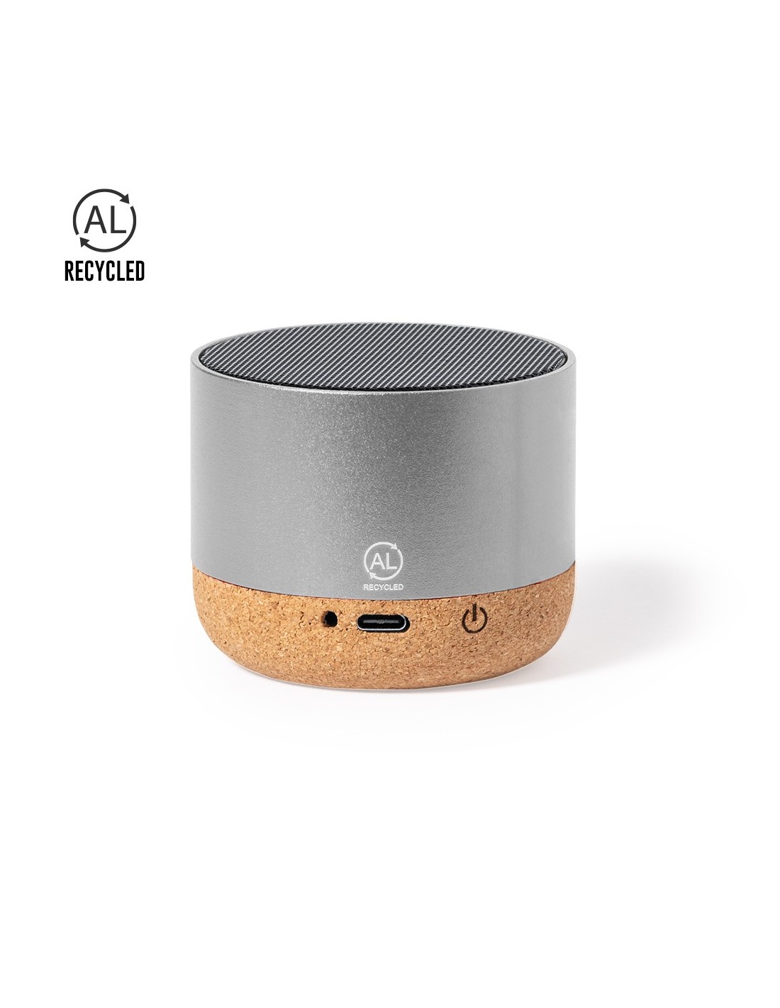 Altavoz fabricado en combinación eco con carcasa de aluminio reciclado y base de corcho natural. Con conexión Bluetooth® y 3W de potencia. Batería de litio de 300mAh. Incluye distintivo aluminio reciclado. Presentado en caja individual de diseño kraft. Disponible manual de instrucciones en español e inglés. El aluminio reciclado es un material con posibilidades de reciclaje casi infinitas, sin perder sus propiedades originales y consumiendo menos energía en este proceso. Certificación GRS (Global Recycled Standard / Estándar de Reciclaje Global), que garantiza el origen reciclado del material usado para fabricar el producto.