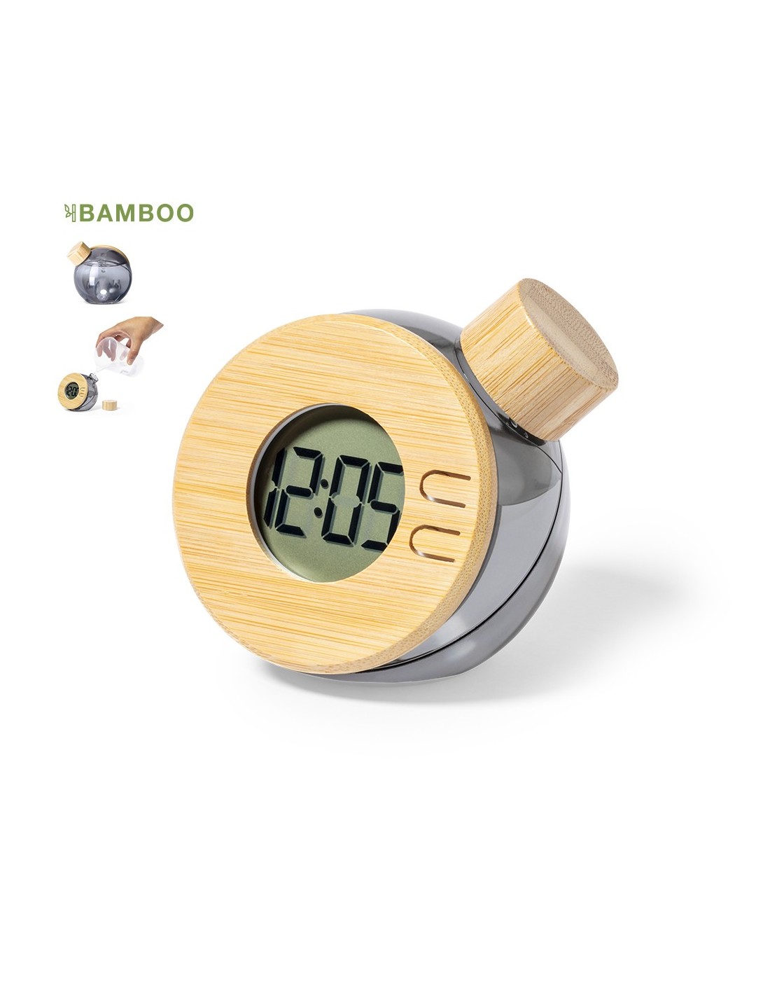 Elegante y sostenible reloj de mesa, fabricado en bambú natural. Funcionamiento único, sin necesidad de baterías. Simplemente funciona con agua, un tributo a la sostenibilidad y la innovación. Gran pantalla LCD que muestra la hora en formato de 12 horas, AM y PM. Incluye indicador de fecha que proporciona información adicional de un solo vistazo. Este sorprendente reloj viene presentado en una caja de diseño kraft y protegido con papel, reforzando así su estética natural y consciente. Materiales como el bambú fomentan la utilización de materias primas naturales reduciendo las emisiones contaminantes. Además, el bambú proviene de una planta de gran resistencia y versatilidad, con crecimiento y regeneración rápida, siendo una excelente alternativa al uso de madera tradicional.