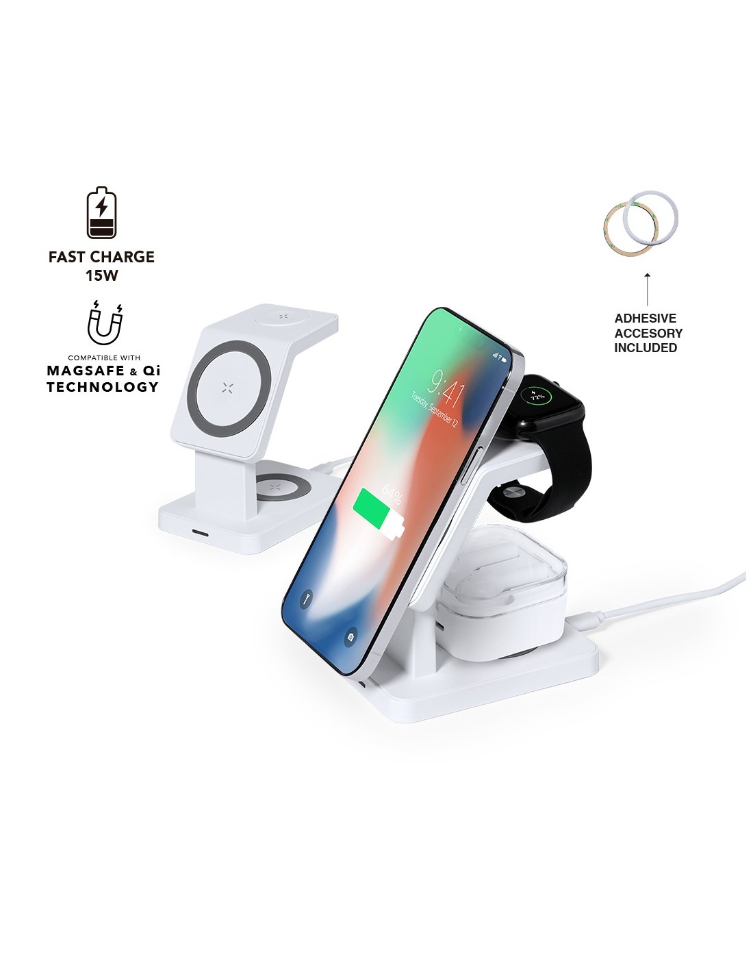 Completo multicargador inalámbrico 15W con soporte para gadgets. Diseñado para la carga simultánea del smartphone, auriculares y smartwatch: una estación de carga todo en uno. Presentado en caja de diseño kraft. Disponible manual de instrucciones en español e inglés.