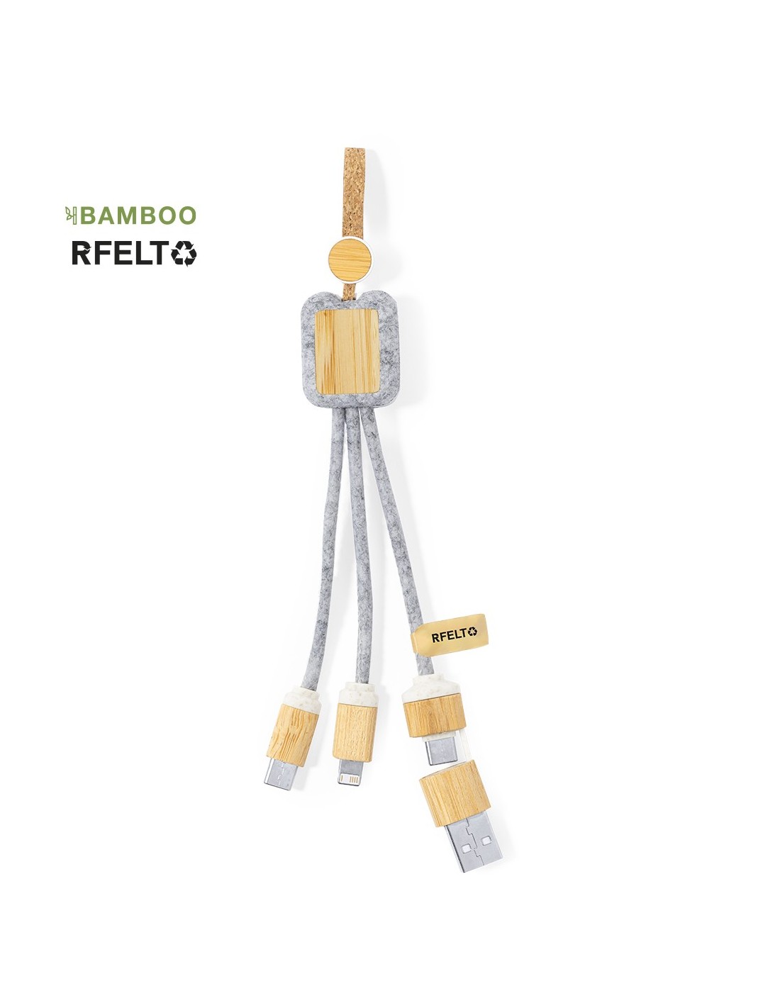 Cable cargador fabricado en bambú y fieltro RPET. Con conexiones de entrada Tipo C y USB y salidas Tipo C, lightning y Micro USB. 5V DC 2.4A. Presentado en bolsa individual de diseño kraft con autocierre, con distintivo en etiqueta. El fieltro RPET reciclado es fruto de la combinación del proceso de reciclaje de materiales plásticos junto a la técnica milenaria de fabricación del fieltro, dando como resultado un material de eco-tendencia que, además de ser de origen reciclado, también se convierte en reciclable.