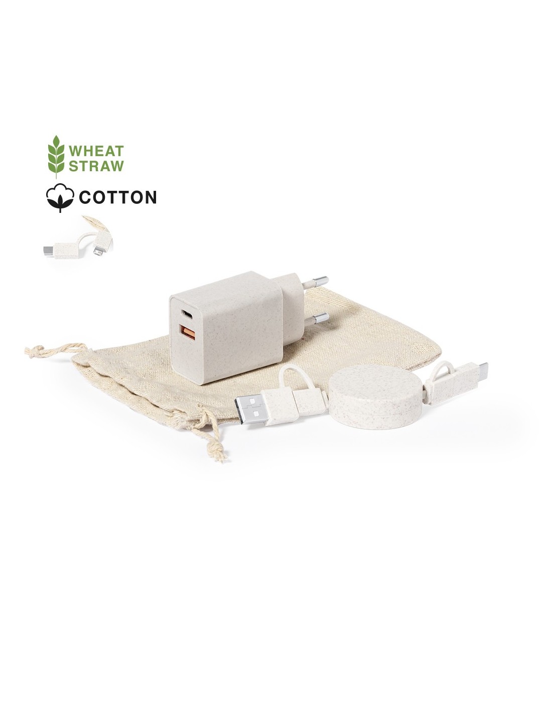 Set de cargador USB de pared con carga rápida y cable cargador con transferencia de datos, fabricados en fibra de trigo. Cargador con salida USB y Tipo C, y cable extensible con conexión Micro USB, Tipo C y Lightning. Enchufe europeo. Presentado en bolsa de algodón crudo 100% natural, con cierre de cordón. La caña de trigo fomenta la utilización de materias primas naturales, reduciendo así las emisiones contaminantes.