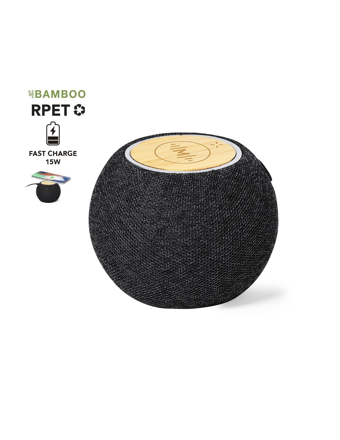 Altavoz multifunción con conexión Bluetooth®. Con carga inalámbrica de 15W para dispositivos con tecnología Qi. Carcasa fabricada en bambú y poliéster RPET, 5W de potencia, batería de 1200 mAh y conexión Bluetooth® 5.0. Incluye cable cargador Tipo C. Con distintivo RPET y presentado en caja individual de diseño kraft. Disponible manual de instrucciones en español e inglés. El material RPET se elabora a partir de plástico reciclado, para así fomentar la reutilización de residuos plásticos y ayudar a la sostenibilidad del planeta.