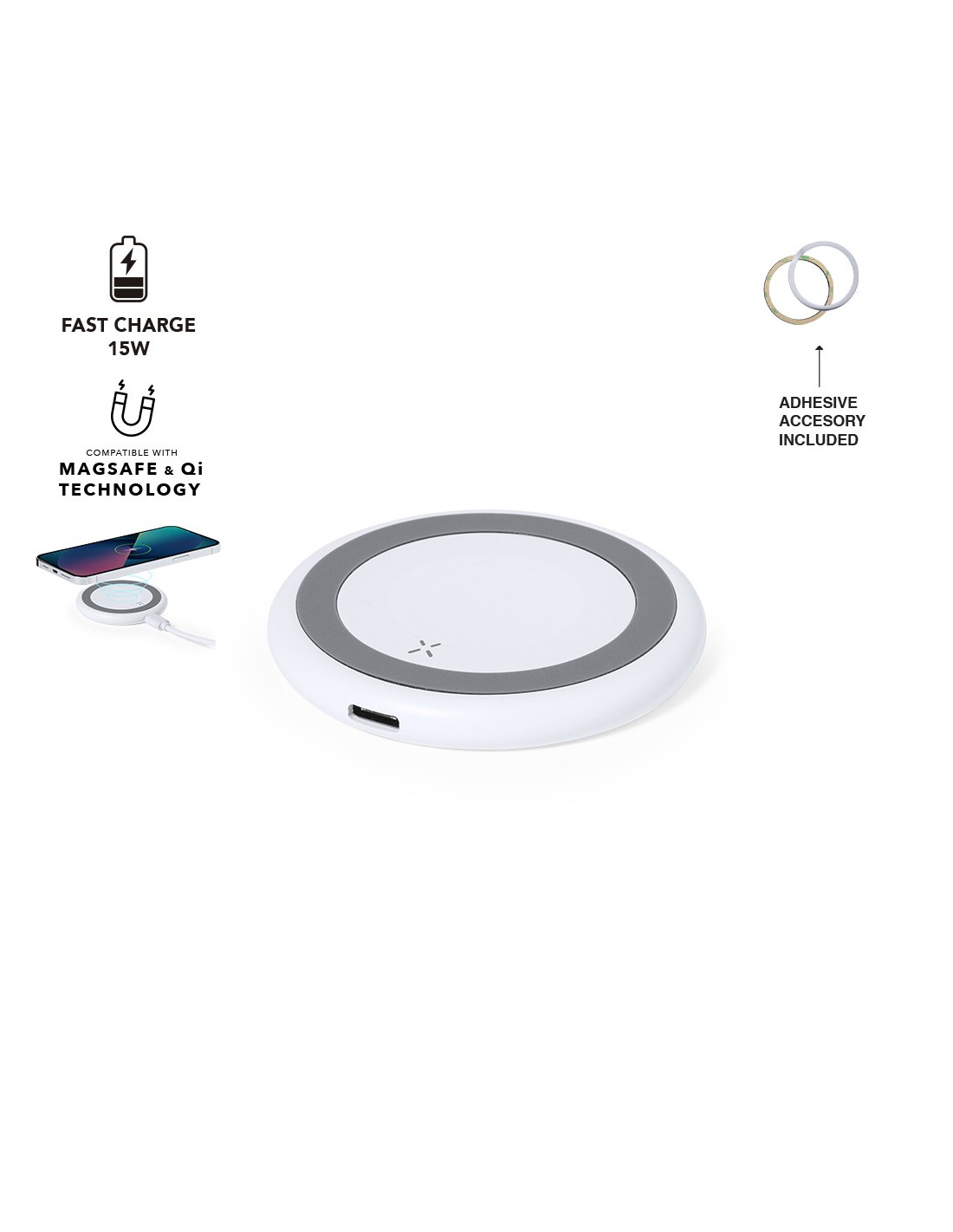 Cargador inalámbrico 15W de diseño circular. Base antideslizante y compatible con dispositivos equipados con tecnología de carga Qi. Diseñado para la carga de smartphone, auriculares y smartwatch. Presentado en atractiva caja de diseño kraft. Disponible manual en español e inglés.