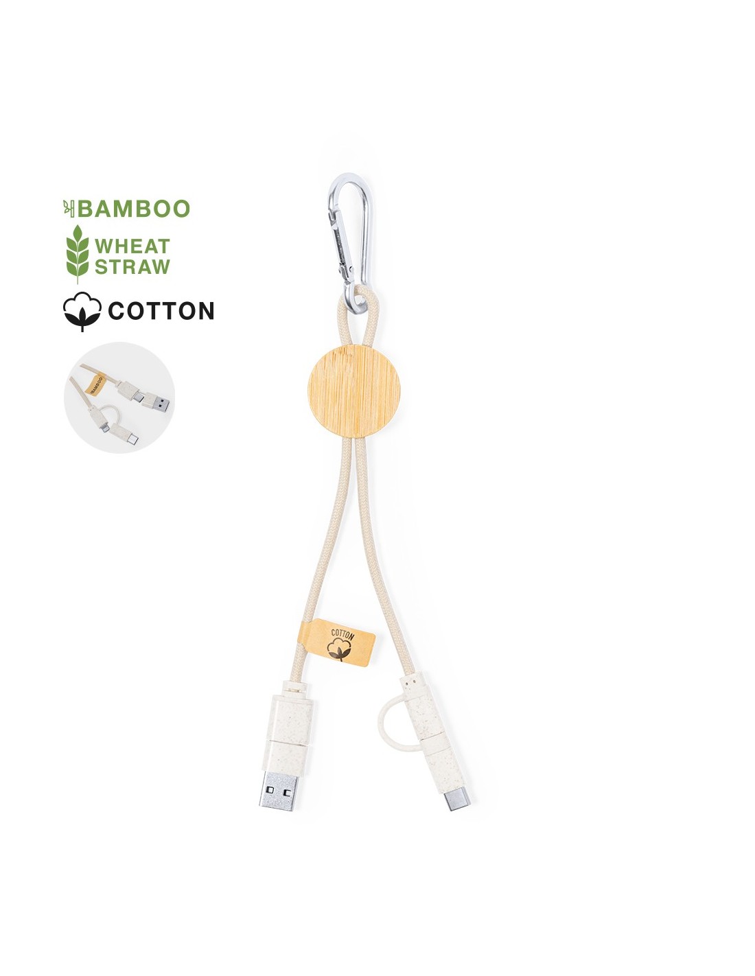Cable cargador con mosquetón de transporte. Fabricado usando materiales naturales y respetuosos con el medio ambiente: Pieza central en bambú natural. Cables recubiertos de algodón, incluyen conexiones de entrada Tipo C y USB, salidas Lightning, Micro USB y Tipo C. 5V DC 2.4A. Presentado en bolsa individual de diseño kraft. Poner que lleva distintivo en hangtag de bambú y algodón kraft. Elaborado con elementos vegetales para así fomentar la utilización de materias primas naturales y reducir las emisiones contaminantes.