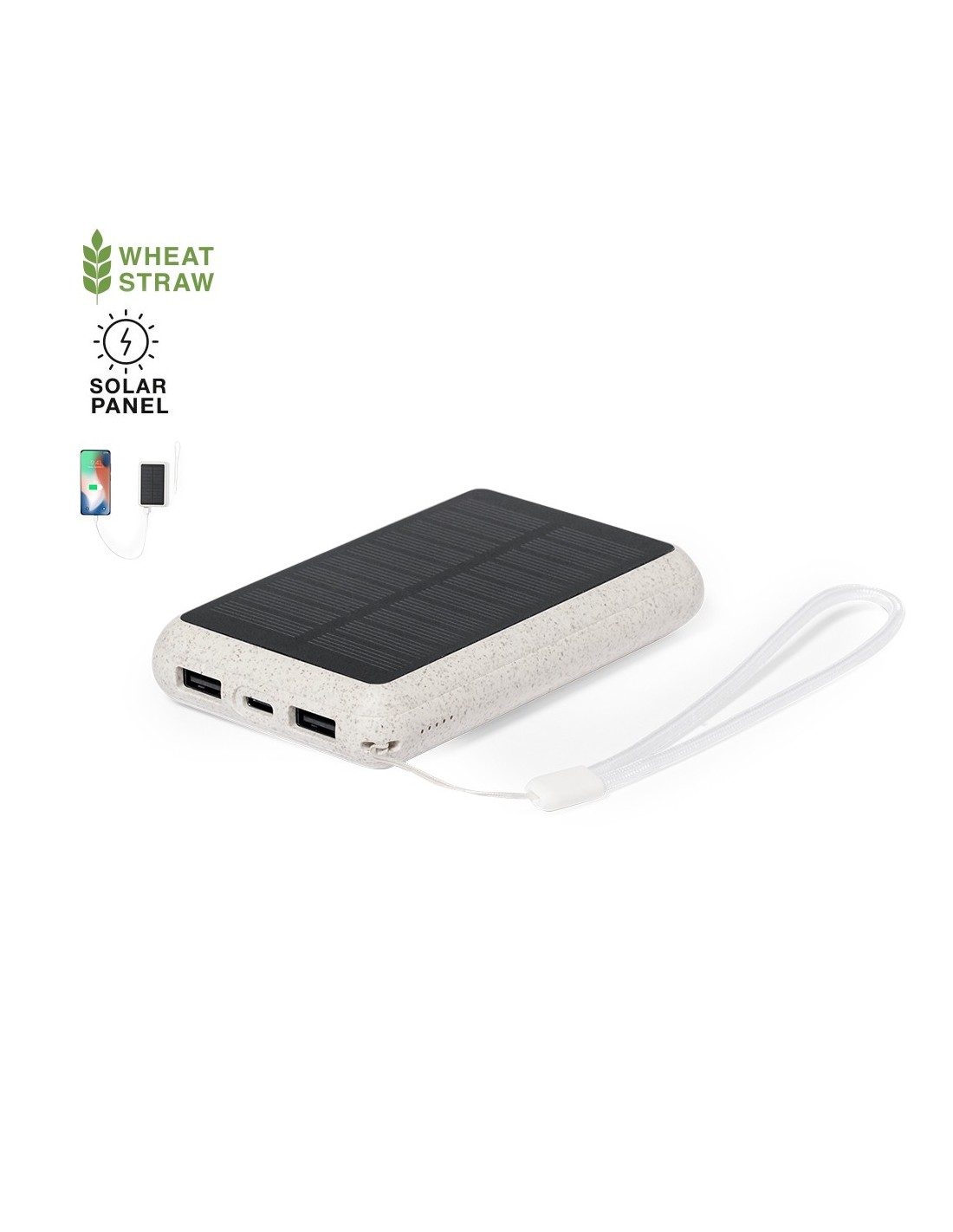 Batería auxiliar externa de recarga solar fabricada en fibra de trigo. De 5.000 mAh capacidad de carga. Con conector de entrada/salida Tipo C + salidas USB. Incluye panel fotovoltáico que brinda la facilidad de recargar la batería en cualquier espacio exterior sin necesidad de conexión. Presentado en una caja de diseño de kraft. Tipo C Entrada/Salida: 5V DC 2.4A, 12W 2 Saidas USB: 5V DC 2.4A, 12W Las capacidades mostradas en todas nuestras baterías auxiliares externas son reales, incorporando todas ellas baterías de grado A y no recicladas, con una vida útil de al menos 500 ciclos de carga y según normativa CE. Además, están fabricadas conforme a los estándares RoHS y en cumplimiento con los siguientes requisitos de seguridad: Sistema de protección contra sobrecarga del power bank. Sistema de protección contra descarga completa que proporciona una mayor durabilidad del power bank. Sistema de bloqueo para evitar cortocircuitos. Sistema de transferencia de carga constante, acorde con la capacidad del dispositivo de destino. La caña de trigo fomenta la utilización de materias primas naturales, reduciendo así las emisiones contaminantes.