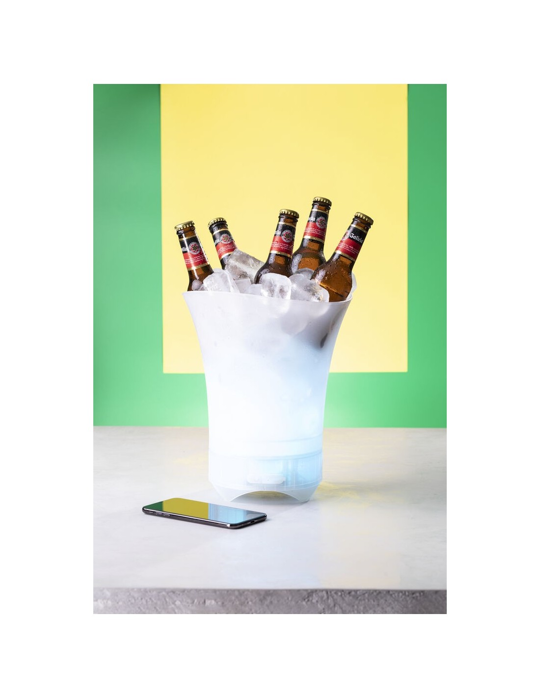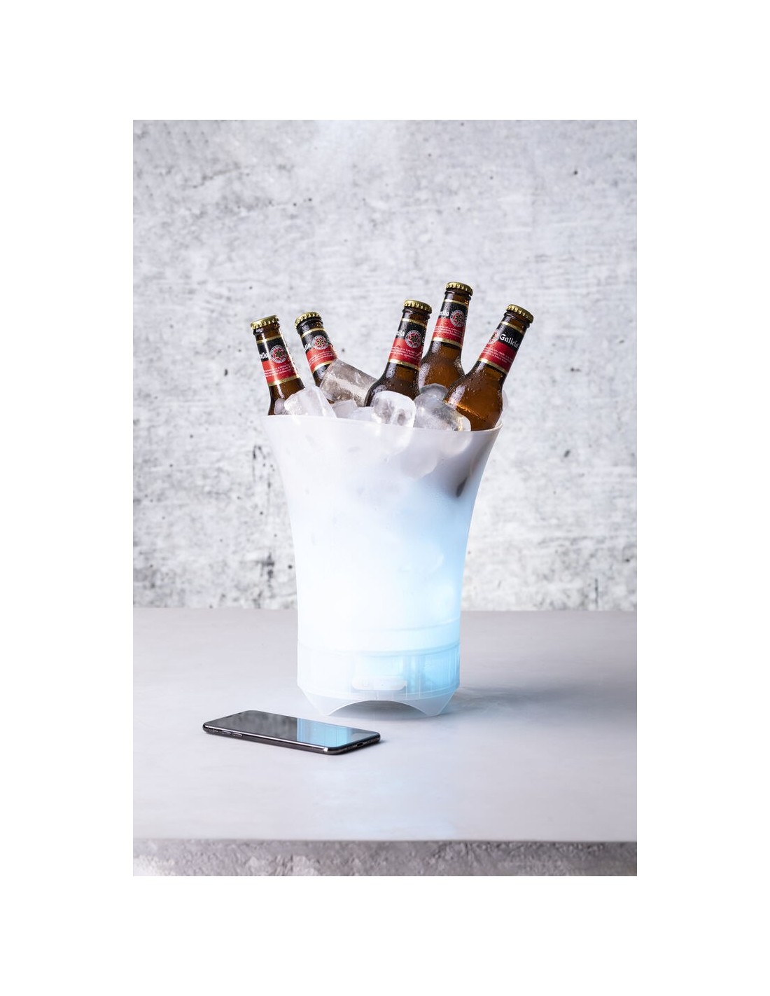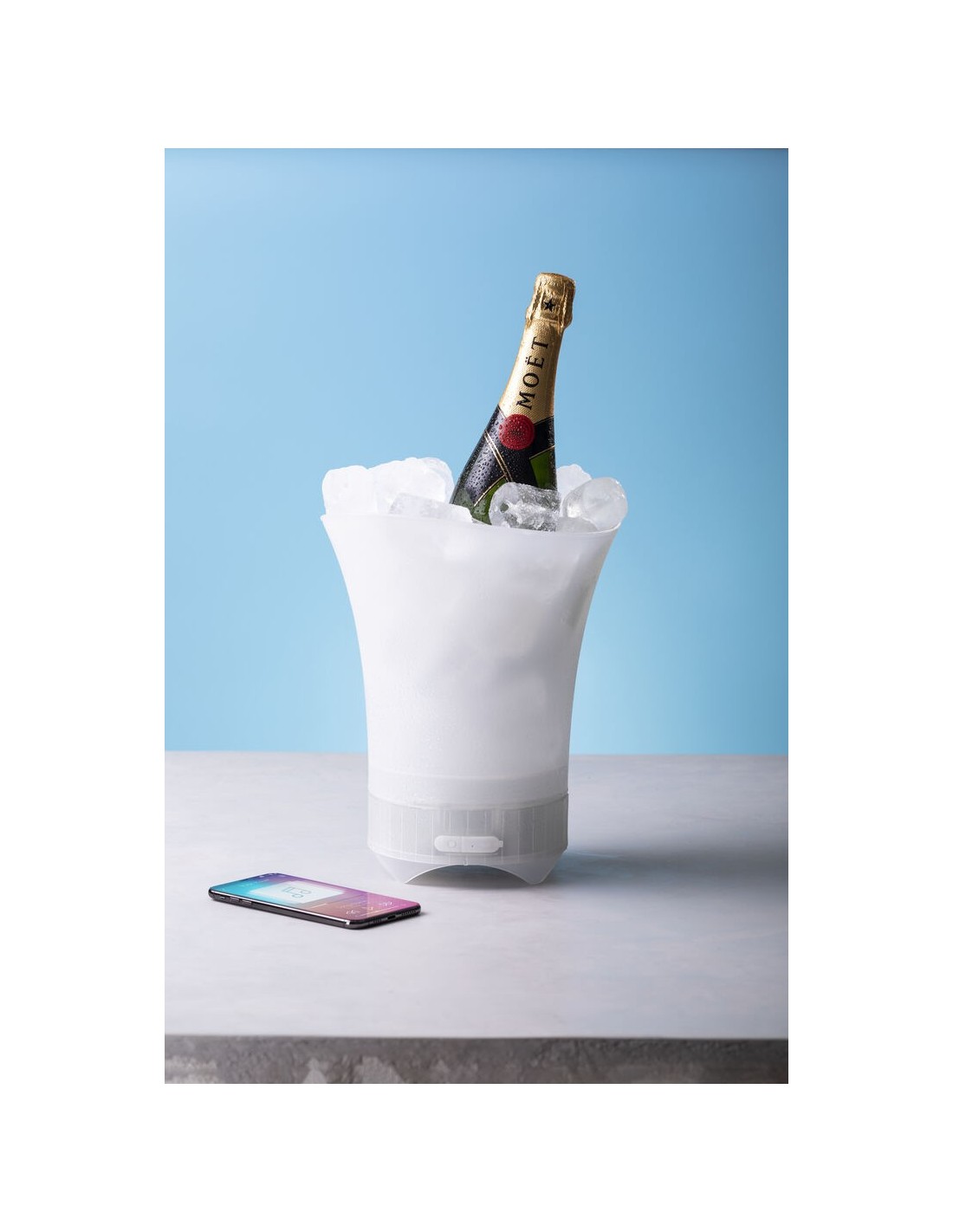 Original cubitera con potente altavoz integrado en la base. En resistente material de acabado translúcido y con conexión Bluetooth® 5.0, ofrece unos más que respetables 5W de potencia. Con iluminación inteligente LED en el interior que sigue el ritmo de la música. Recargable mediante cable micro USB (incluido) y presentada en atractiva caja de diseño.