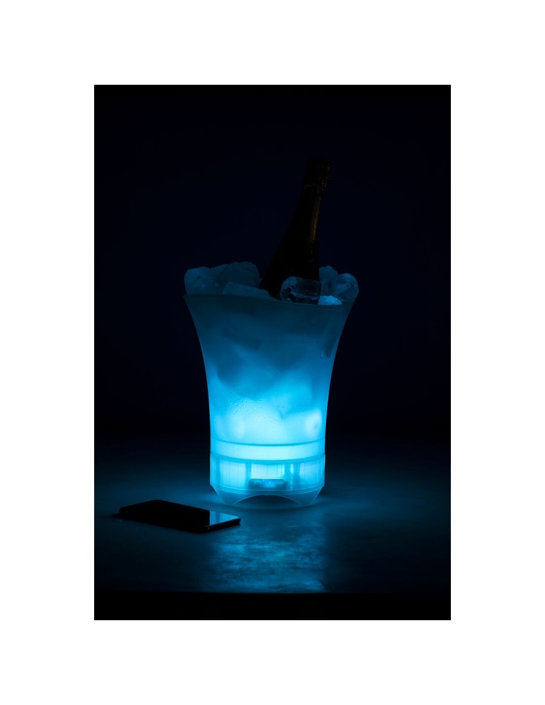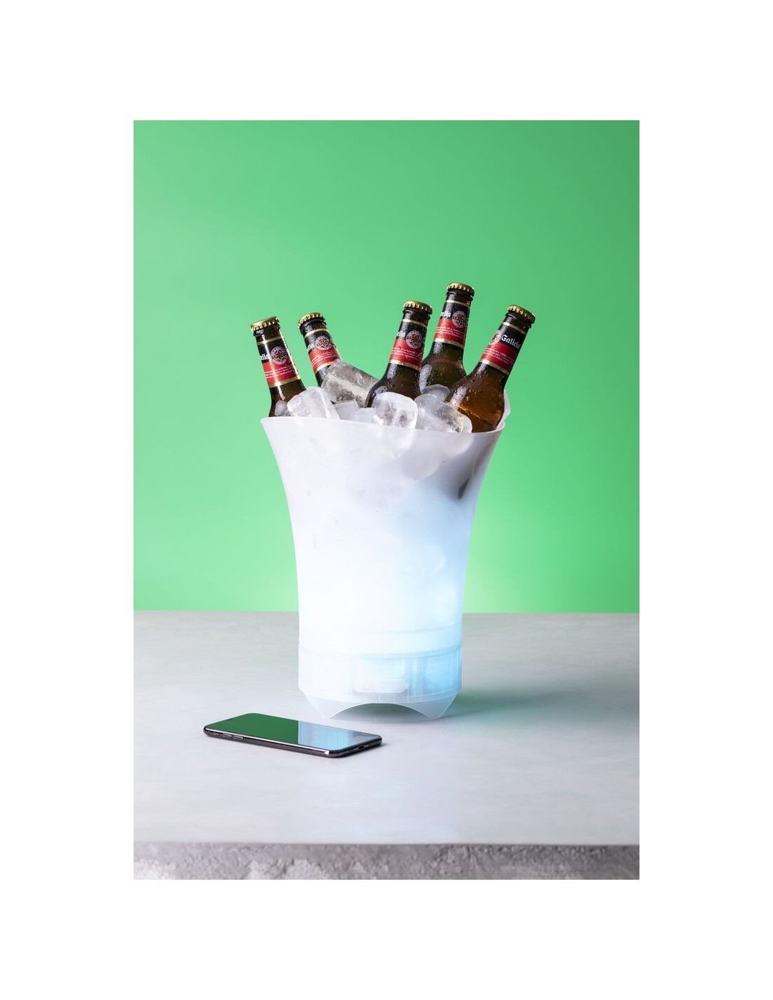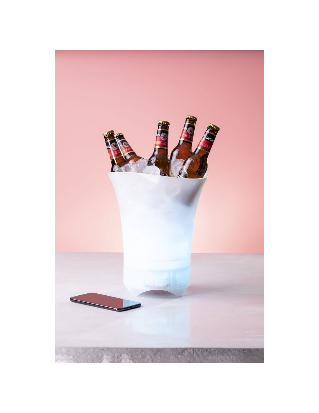 Original cubitera con potente altavoz integrado en la base. En resistente material de acabado translúcido y con conexión Bluetooth® 5.0, ofrece unos más que respetables 5W de potencia. Con iluminación inteligente LED en el interior que sigue el ritmo de la música. Recargable mediante cable micro USB (incluido) y presentada en atractiva caja de diseño.