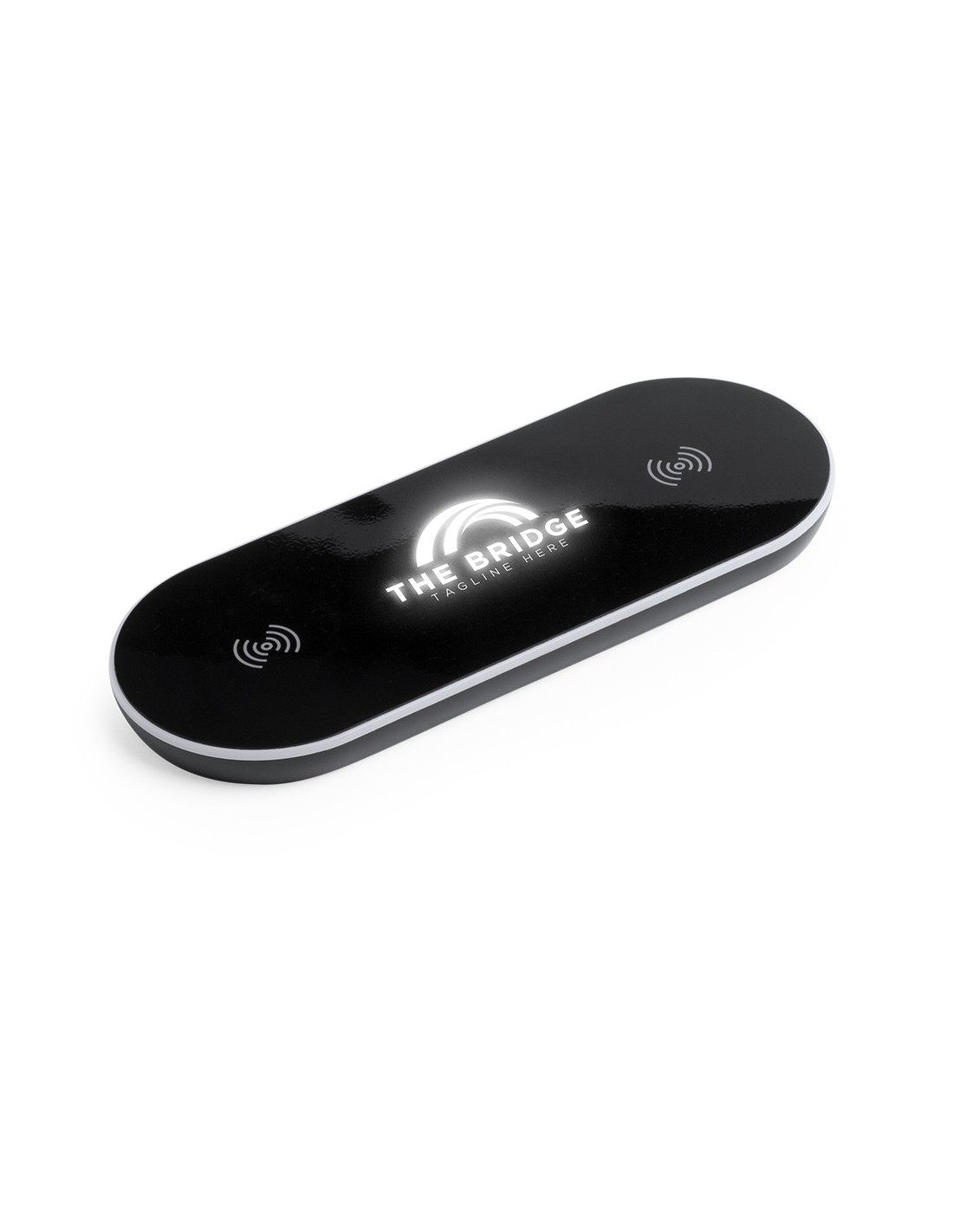 Cargador inalámbrico para carga simultánea de hasta 2 dispositivos. En elegante color negro, con luz led interior y un recubrimiento exterior especialmente diseñado para marcaje en láser, con el que conseguirá que su publicidad o marca quede iluminada con luz blanca. Base antideslizante y compatible con dispositivos equipados con tecnología de carga inalámbrica. Presentado en atractiva caja de diseño. Cable USB incluido.