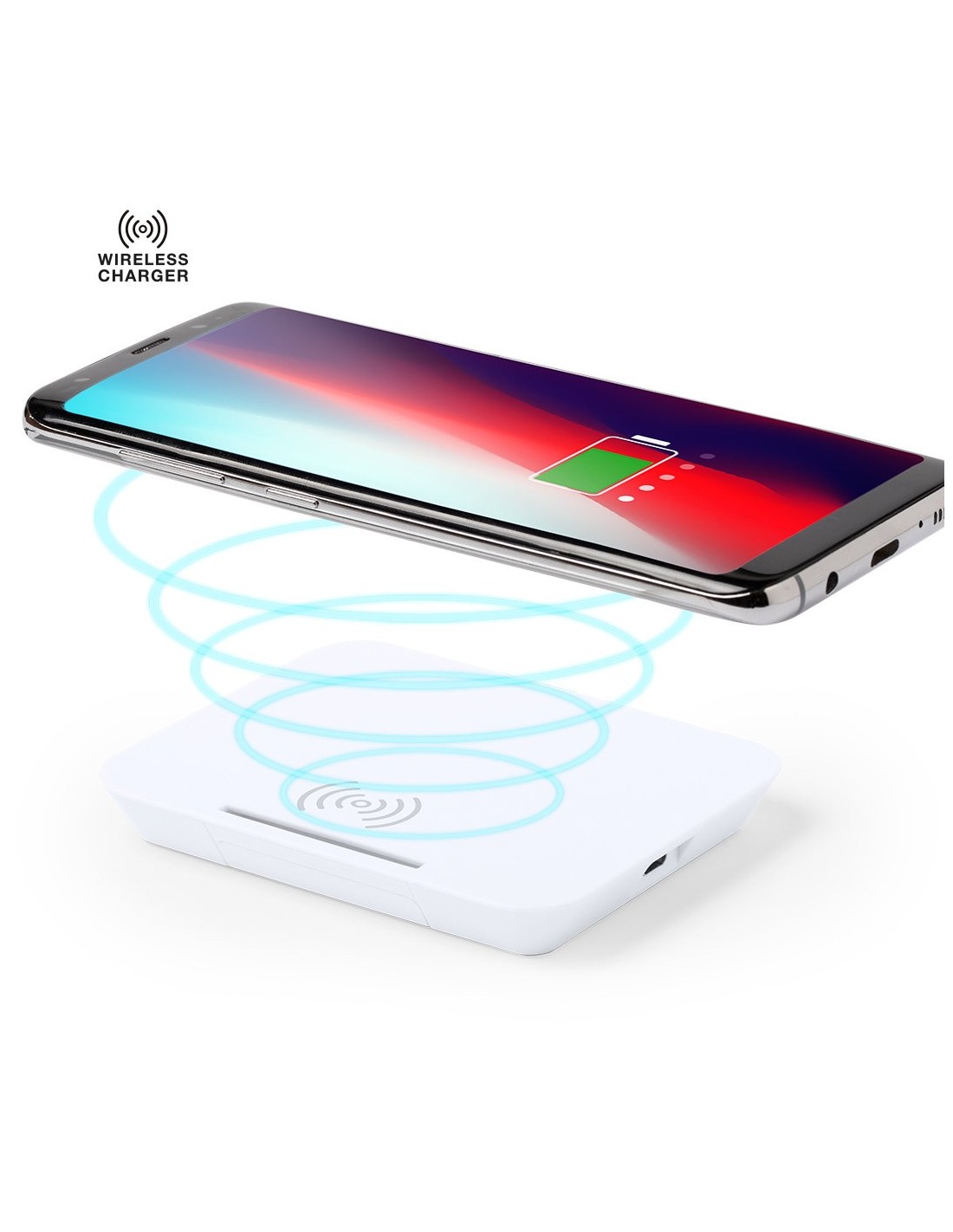 Cargador inalámbrico con función soporte de smartphone. De sobrio diseño monocolor en blanco, con cable de carga micro USB incluido. Compatible con dispositivos equipados con tecnología de carga inalámbrica. Presentado en atractiva caja de diseño.