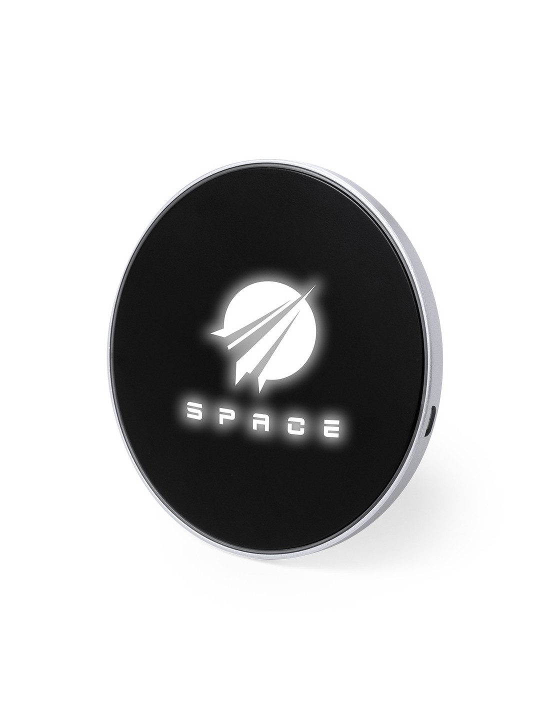 Cargador inalámbrico circular. En elegante color negro, con luz led interior y un recubrimiento exterior especialmente diseñado para marcaje en láser, con el que conseguirá que su publicidad o marca quede iluminada con luz blanca. Base antideslizante y compatible con dispositivos equipados con tecnología de carga inalámbrica. Presentado en atractiva caja de diseño. Cable USB incluido.