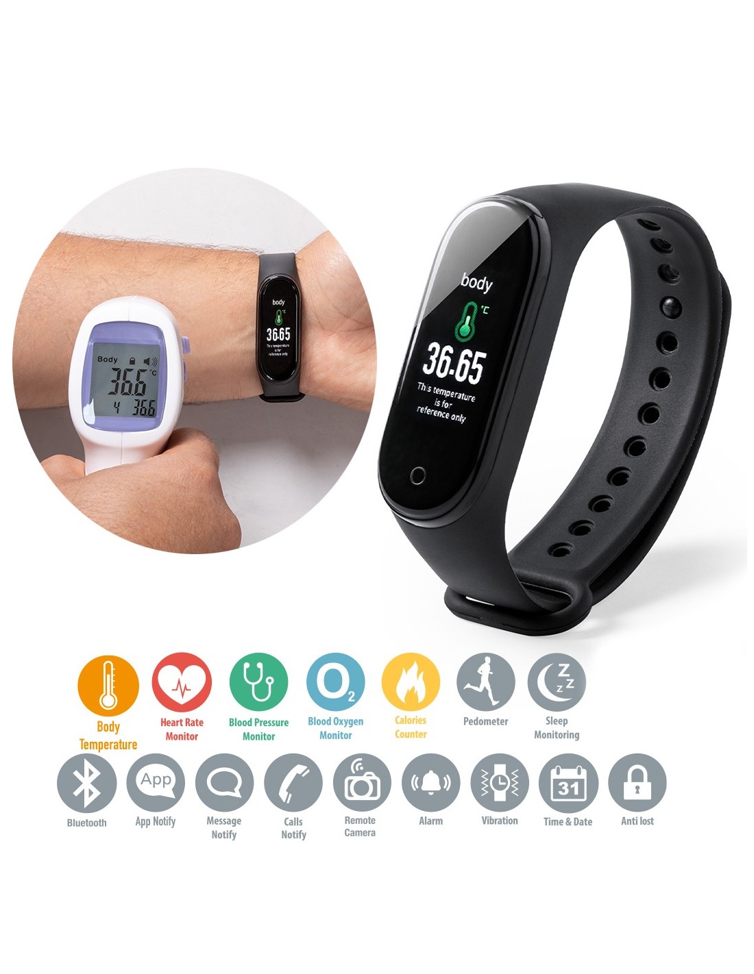 Brazalete inteligente multifunción con medición automática de temperatura corporal cada 5 minutos y sincronización de valores en App para un control de registro de temperatura, monitorización de frecuencia cardíaca, despertador y multitud de funciones más que lo convierten en el gadget perfecto para el día a día. Conexión Bluetooth® 4.0, con batería integrada recargable mediante cable USB. Cuerpo en material TPU y pantalla a color TFT integrada de 0,96 pulgadas . APP disponible para iOS y Android. Presentado en atractiva caja de diseño.