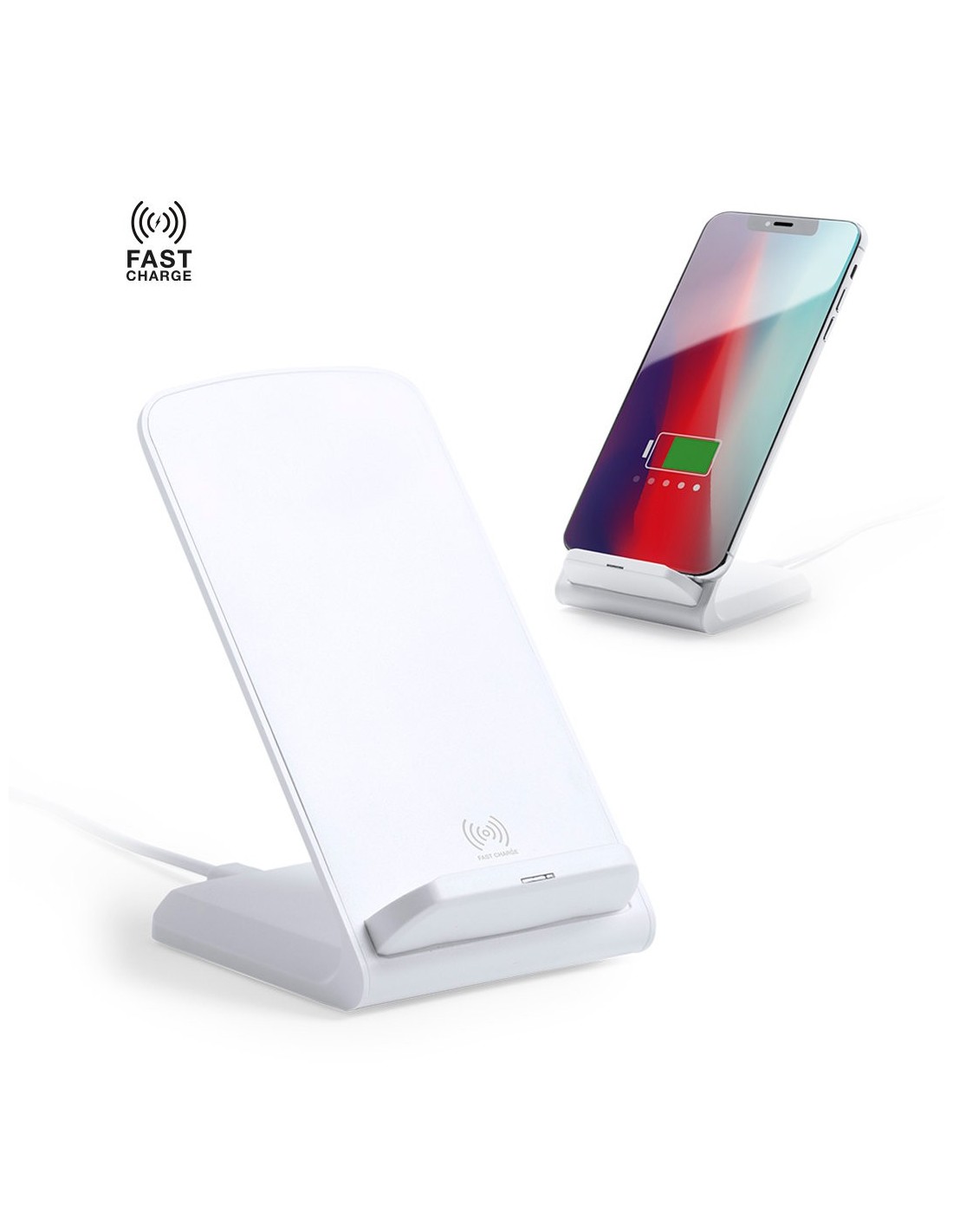 Cargador inalámbrico en elegante acabado blanco con función soporte para móvil. Función carga rápida de 10W y compatible con dispositivos equipados con tecnología de carga inalámbrica. Amplia superficie de marcaje y presentado en atractiva caja de diseño.