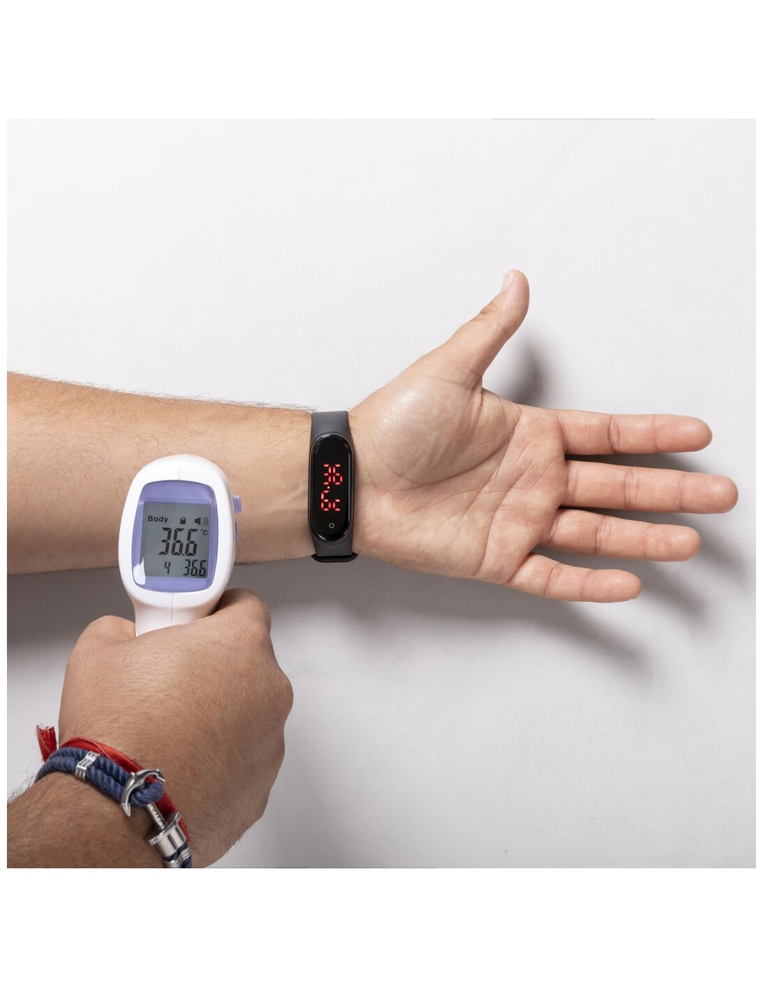 Reloj brazalete con función termómetro. Sus diversas funciones permiten medir la temperatura corporal en un rango entre 34-42 grados y conocer la hora. Cuenta con aviso de temperatura cuando el valor es superior a 37 grados en pantalla. Con batería recargable de gran autonomía de funcionamiento de hasta 30 días, recargable mediante cable USB. Su cuerpo en material TPU y su pantalla LED integrada de 0,96 pulgadas lo convierten en el gadget perfecto para el día a día. Presentado en atractiva caja de diseño.