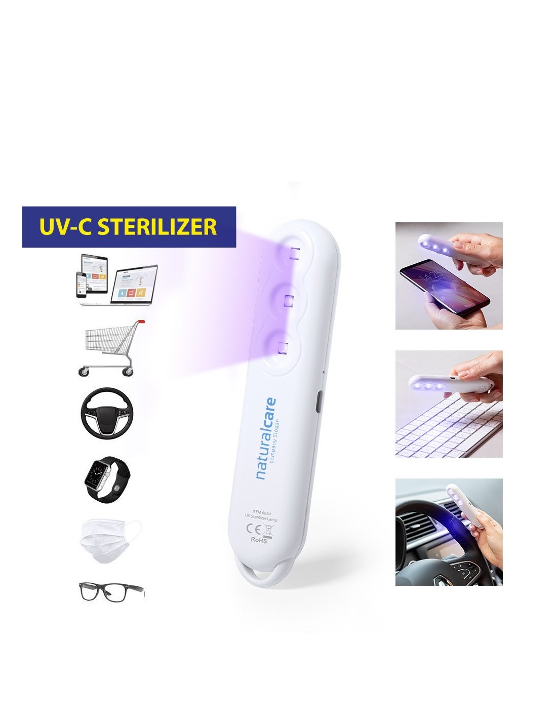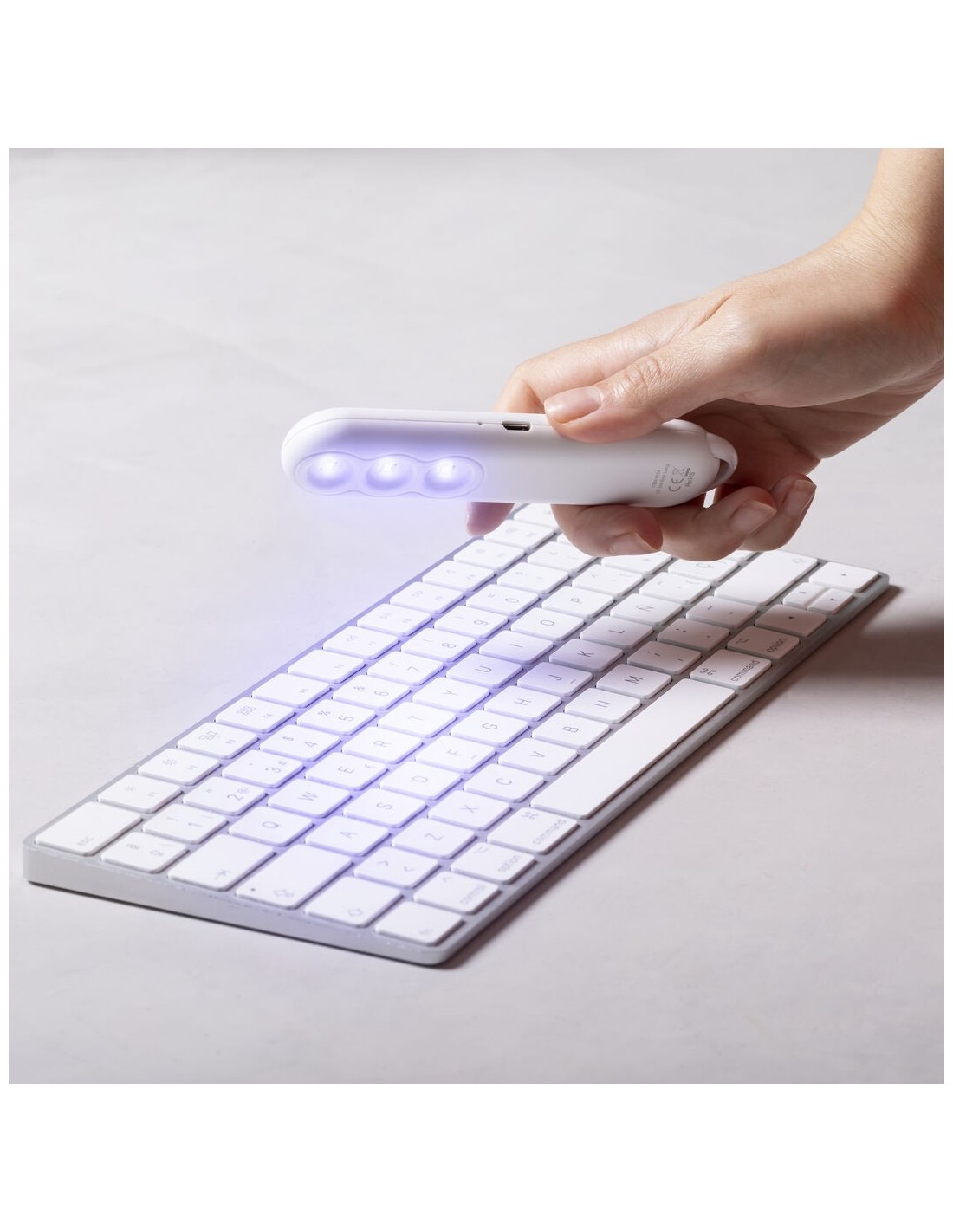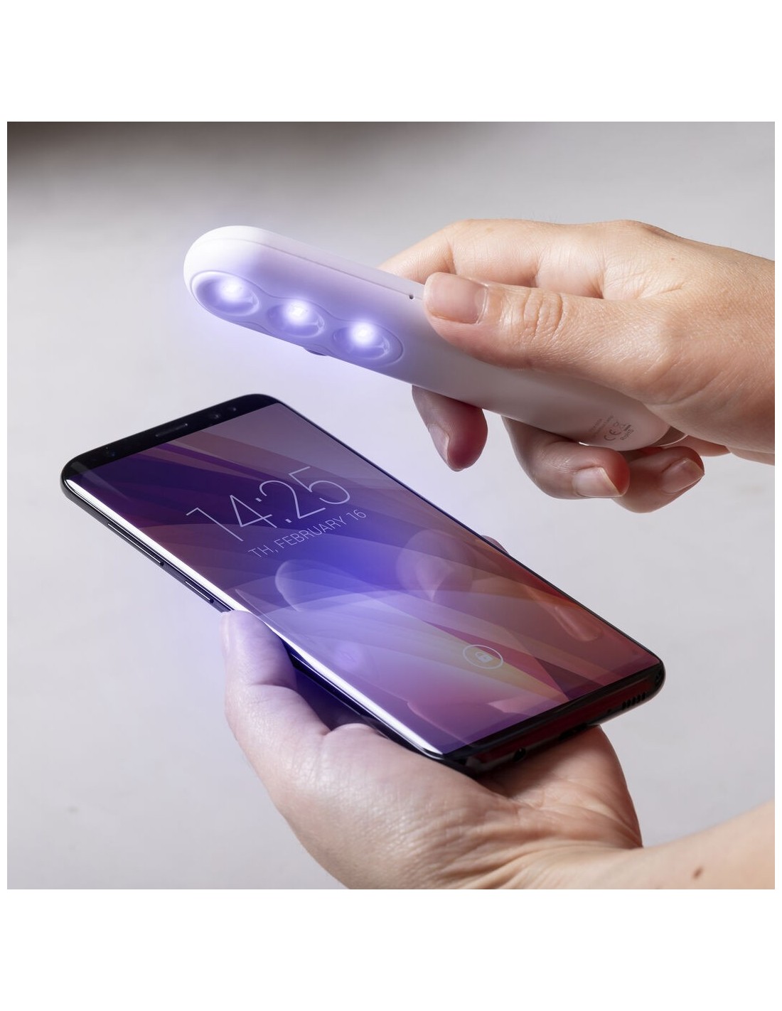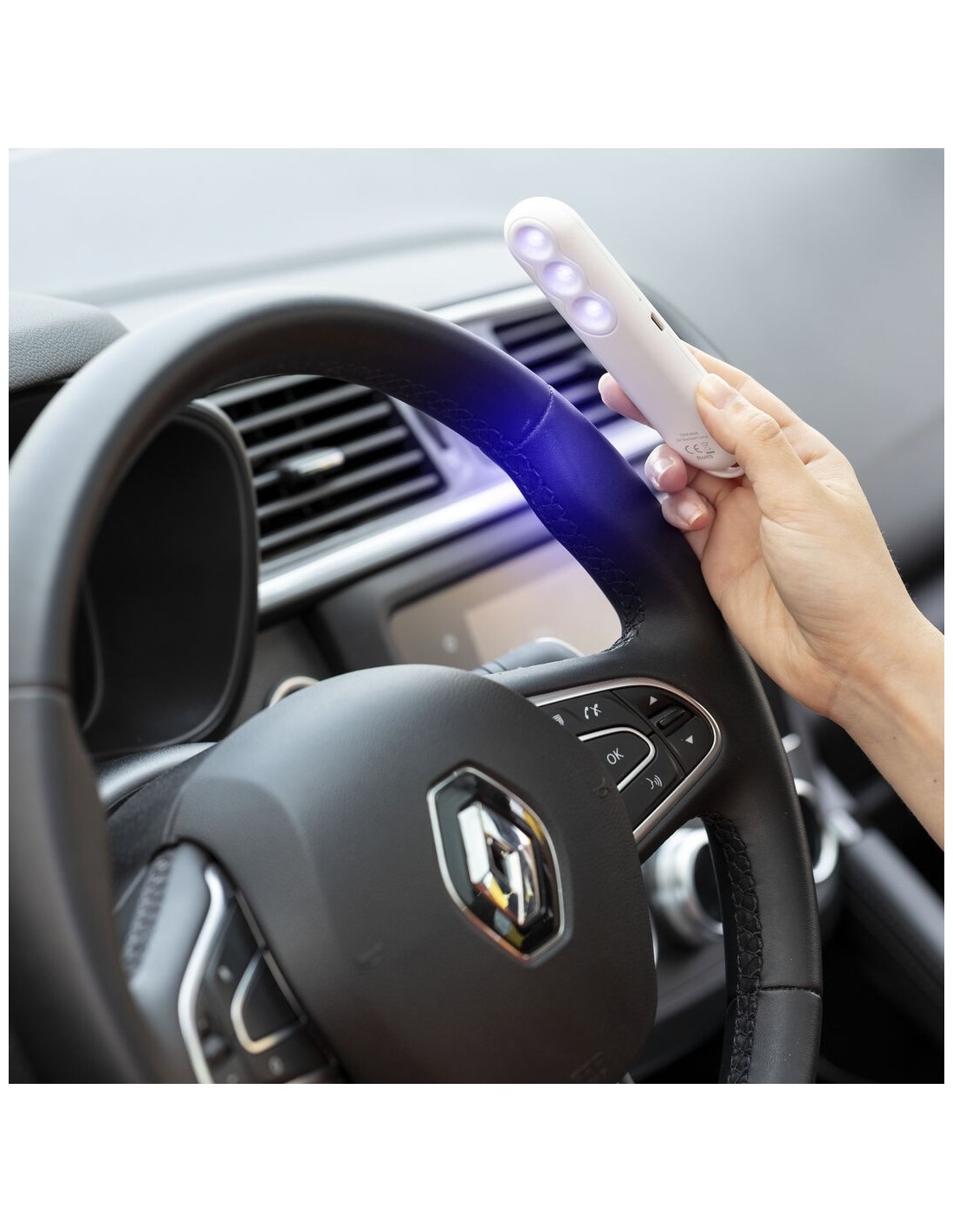 Lámpara esterilizadora de luz ultravioleta tipo C. Especialmente diseñada para la eliminación de microorganismos y bacterias en objetos de uso cotidiano como el smartphone, el carrito de la compra, el volante del coche o la ropa. Fácil de usar, basta con acercar la lámpara esterilizadora al objeto durante unos segundos, a una distancia de entre 1 y 2 cm. Potencia de bombilla 1.5W, longitud de onda de 275 nm y voltaje 3V, con bateria recargable integrada para una autonomía prolongada (Cable USB incluido). Fabricada en resistente material ABS de acabado mate y presentada en atractiva caja individual de diseño. Disponible manual de usuario en español e inglés. Disponible certificación CE, RoHS y de efectividad germicida. Para un uso adecuado del producto, evitar el contacto con la piel y los ojos.