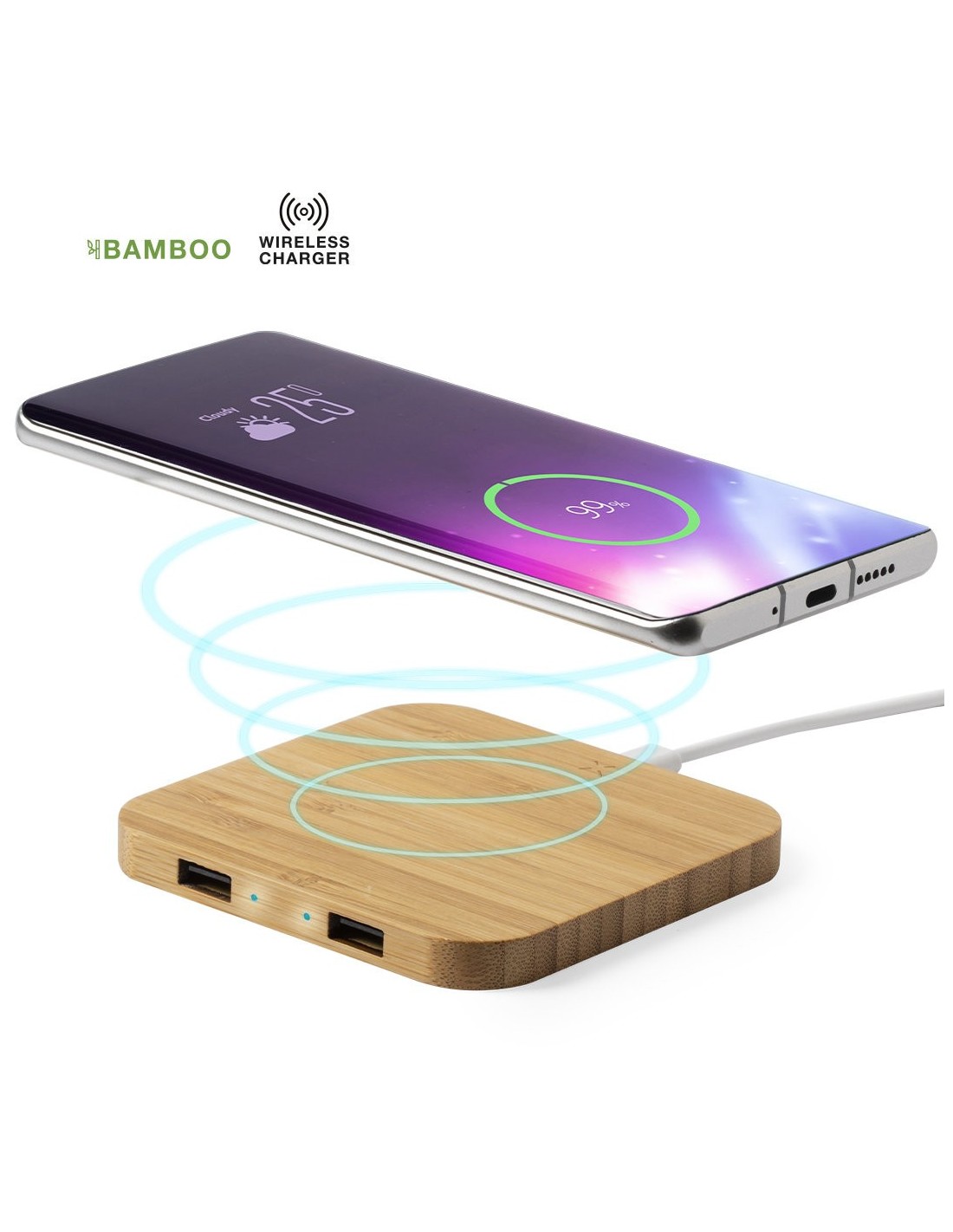 Cargador inalámbrico de línea nature. Carcasa en bambú procedente de cortes naturales. con salida USB dual de 2.100 mA de capacidad para carga simultánea de hasta 3 dispositivos (1 por carga inalámbrica y 2 por cable). Con base antideslizante y compatible con dispositivos equipados con tecnología de carga inalámbrica. Presentado en atractiva caja de diseño eco.