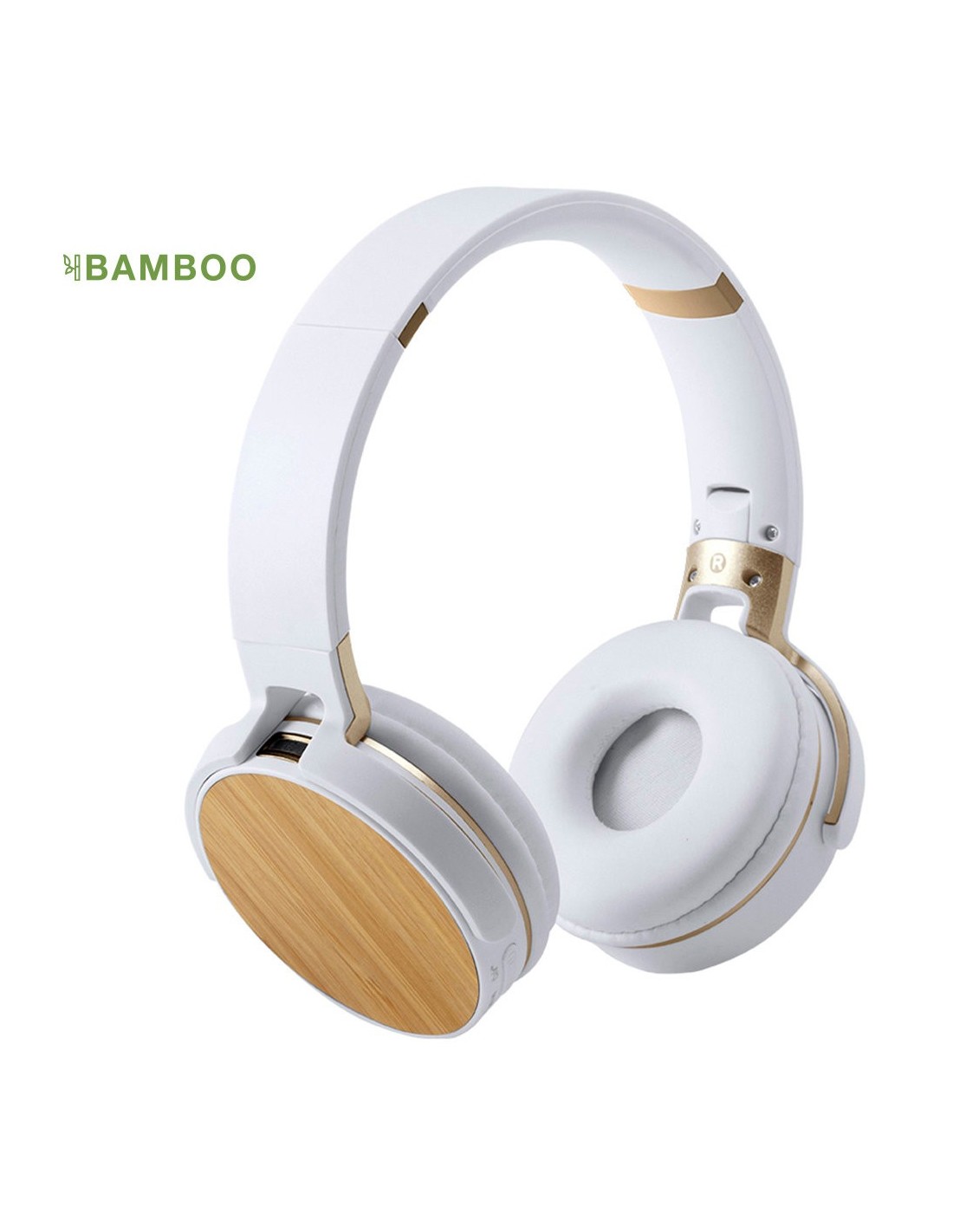 Auriculares de línea nature. Diseño plegable de diadema, con conexión Bluetooth® 5.0 y detalles en bambú procedente de cortes naturales. Con ranura para tarjeta micro SD -tarjeta no incluida-, función manos libres, radio FM, entrada de línea -cable mini jack de 3,5mm incluido- y recargables mediante cable micro USB -incluido-. Con cómodas almohadillas en polipiel de color blanco y presentados en atractiva caja de diseño eco.