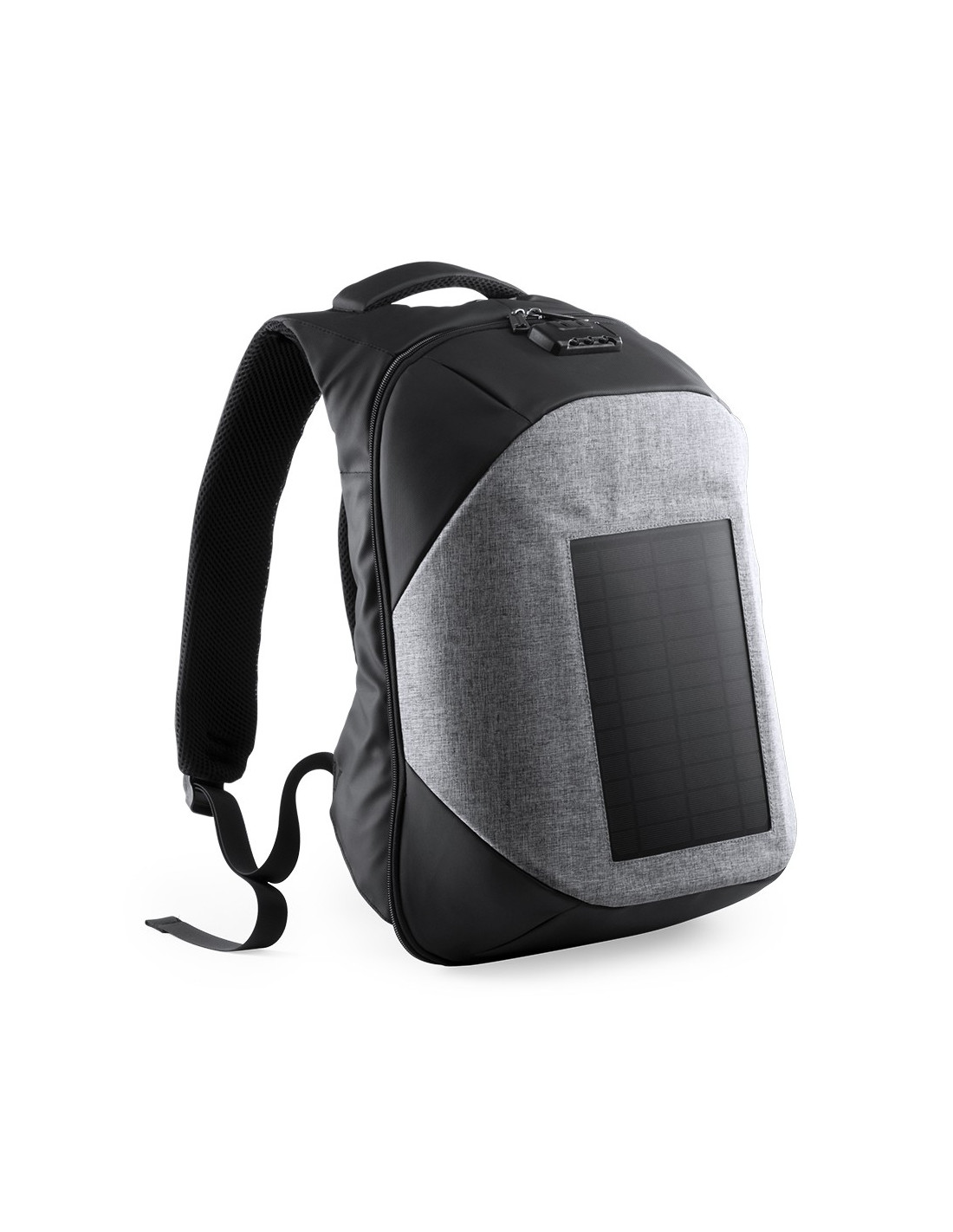 Mochila cargador con panel de carga solar en resistente poliéster 1200D. Resistente al agua, con salida USB para carga -powerbank no incluido- y cierre de seguridad con contraseña. Compartimento principal con doble tirador, con bolsillo acolchado para ordenador portátil de hasta 15 pulgadas y tablet de hasta 10 pulgadas. Cintas de hombros y espalda con acolchado ergonómico.
