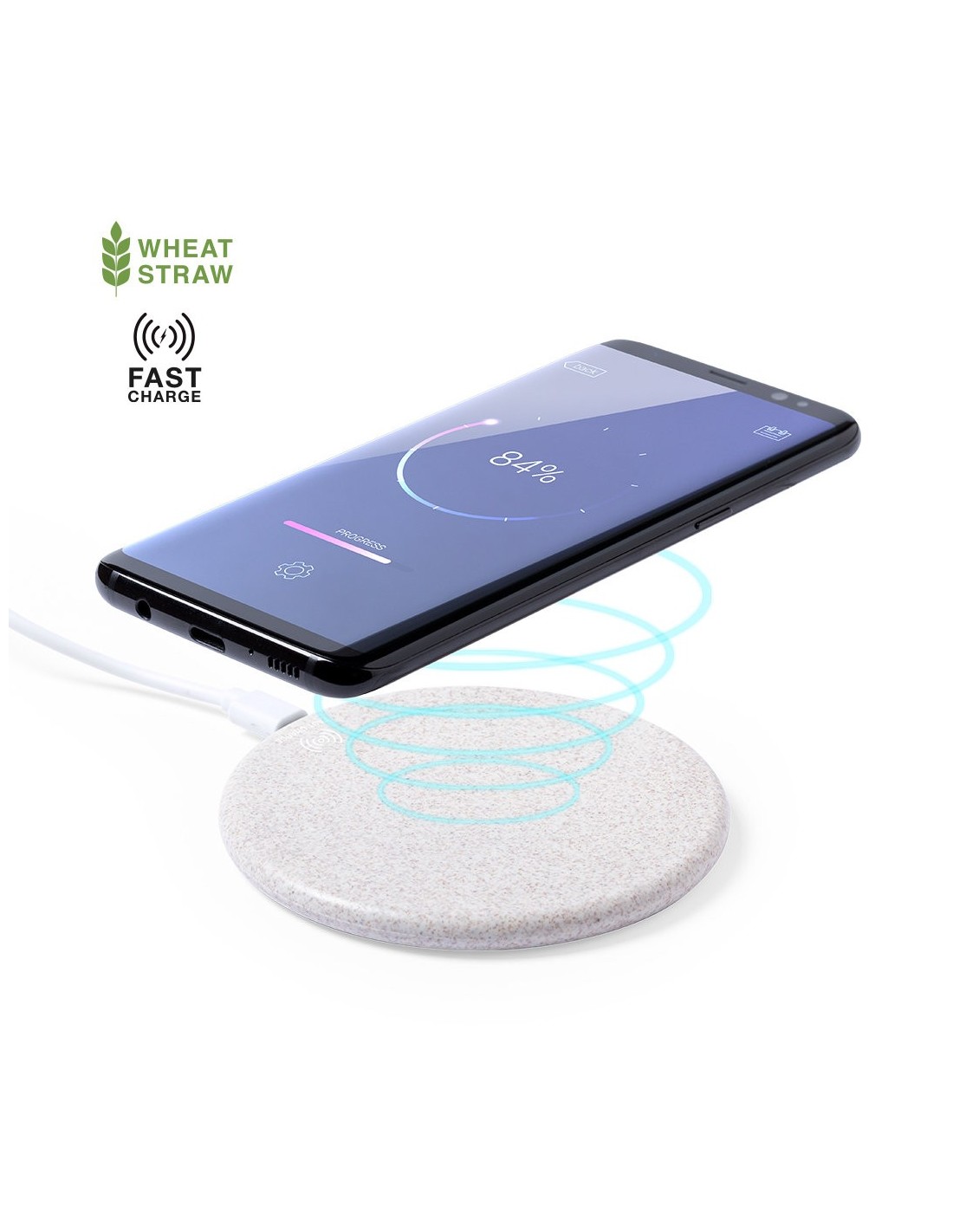 Cargador inalámbrico de diseño circular fabricado en caña de trigo, para así fomentar la utilización de materias primas naturales y reducir las emisiones contaminantes. Con función carga rápida de 10W e indicador led. Cable de carga micro USB incluido y compatible con dispositivos equipados con tecnología de carga inalámbrica. Protección de seguridad para evitar sobrecalentamiento, sobrecarga y cortocircuito. Presentado en atractiva caja de diseño nature.