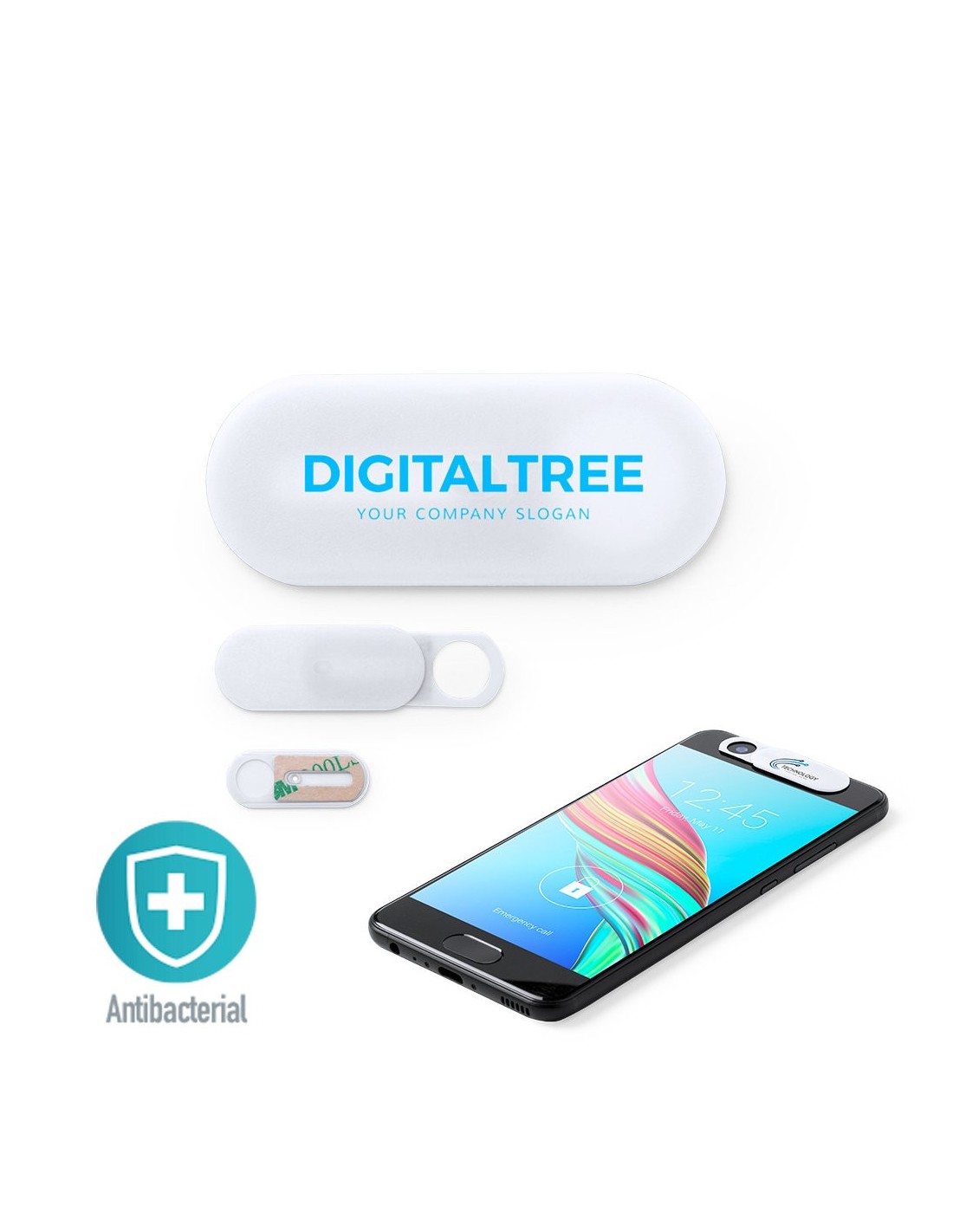 Tapa antibacteriana para cámara de dispositivo móvil, diseñada para proteger la privacidad. Con adhesivo 3M reutilizable y presentada en bolsa individual. Los productos con tratamientos antibacterianos son capaces de reducir drásticamente las cargas bacterianas presentes en las superficies de los materiales, gracias a la incorporación de agentes microbianos permanentes estáticos, con alta efectividad para inhibir y prevenir la contaminación bacteriana. Artículo de acuerdo al estándar ISO 22196, que determina la actividad antibacteriana en materiales plásticos y superficies no porosas, lo que permite conocer la efectividad de inhibición microbiana que tienen los aditivos sobre los objetos tratados mediante una evaluación cuantitativa.