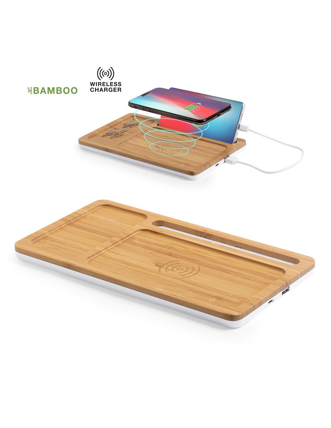 Cargador organizador inalámbrico de línea nature con función soporte para smartphone. Salida USB (cable incluido) de 1.000 mA. Permite cargar de manera simultánea hasta 2 dispositivos (1 mediante carga inalámbrica y 1 mediante cable). Hecho en bambú procedente de cortes naturales, con bandeja para objetos troquelada. Compatible con dispositivos equipados con tecnología de carga inalámbrica. Amplia superficie de marcaje y presentado en atractiva caja de diseño eco.