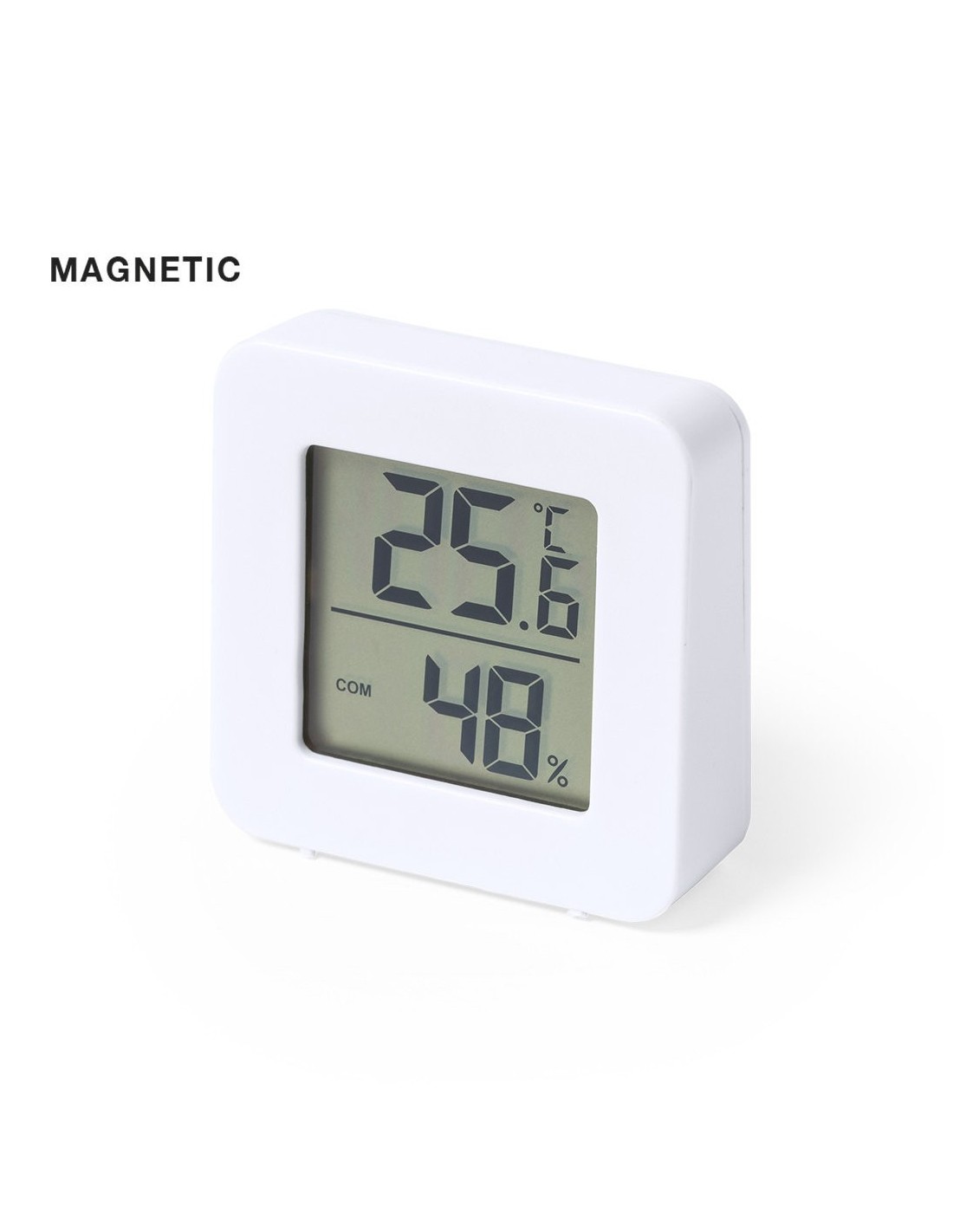 Estación meteorológica fabricada en resistente ABS de acabado blanco. Pantalla LCD de fácil lectura con termómetro y medidor de humedad. Fijación magnética y alimentación con pila (de botón incluida, con film protector). Presentada en caja individual de diseño kraft, con manual de instrucciones en español e inglés.