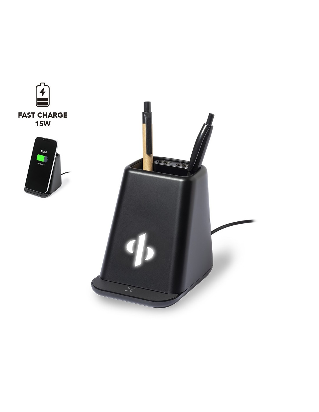 Lapicero multifunción con luz, especialmente diseñado para marcaje en láser e iluminar el logotipo. Con soporte para smartphone y cargador inalámbrico 15W integrado, compatible con dispositivos equipados con tecnología de carga inalámbrica Qi. Incluye 2 salidas USB (5V DC 2A)y cable de carga Tipo C de 150 cm. Base antideslizante y presentado en caja individual de diseño kraft, con manual de instrucciones en español e inglés. Fabricado conforme a los estándares RoHS y en cumplimiento con los siguientes requisitos de seguridad: Sistema de protección contra sobrecalentamiento. Sistema de protección contra sobrecarga. Sistema de bloqueo para evitar cortocircuitos.