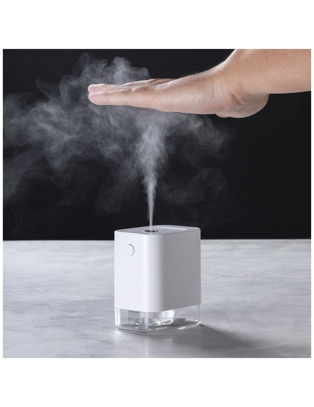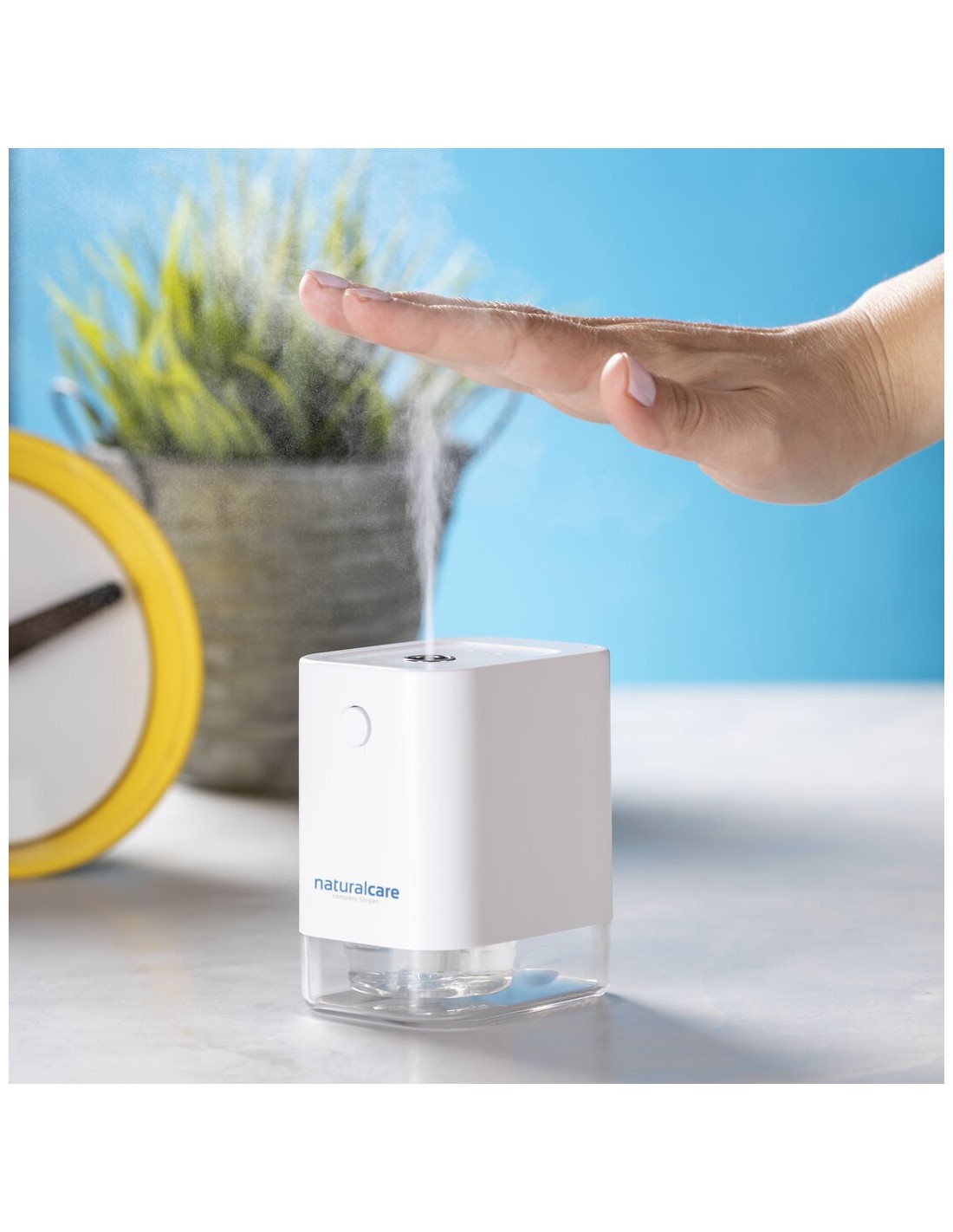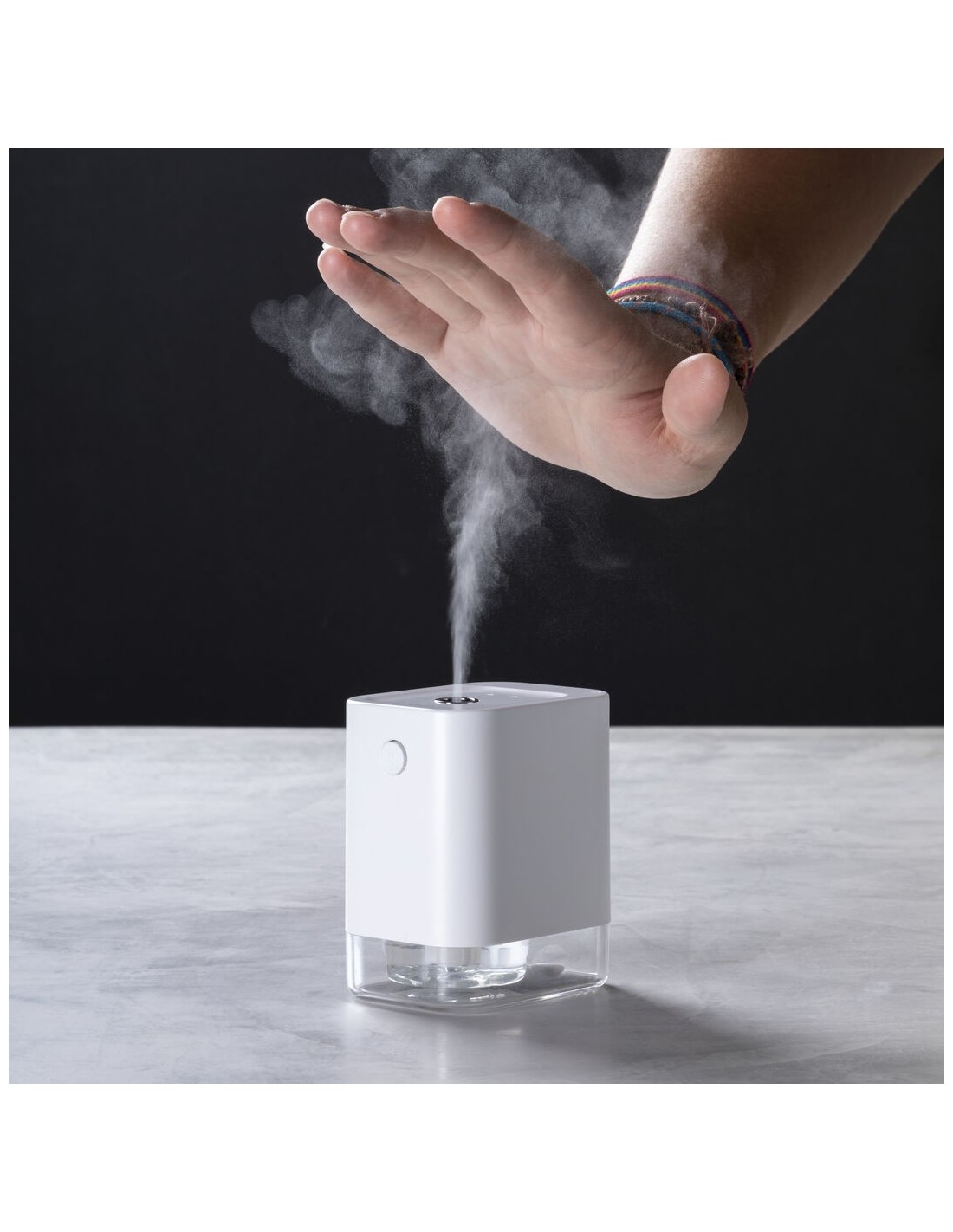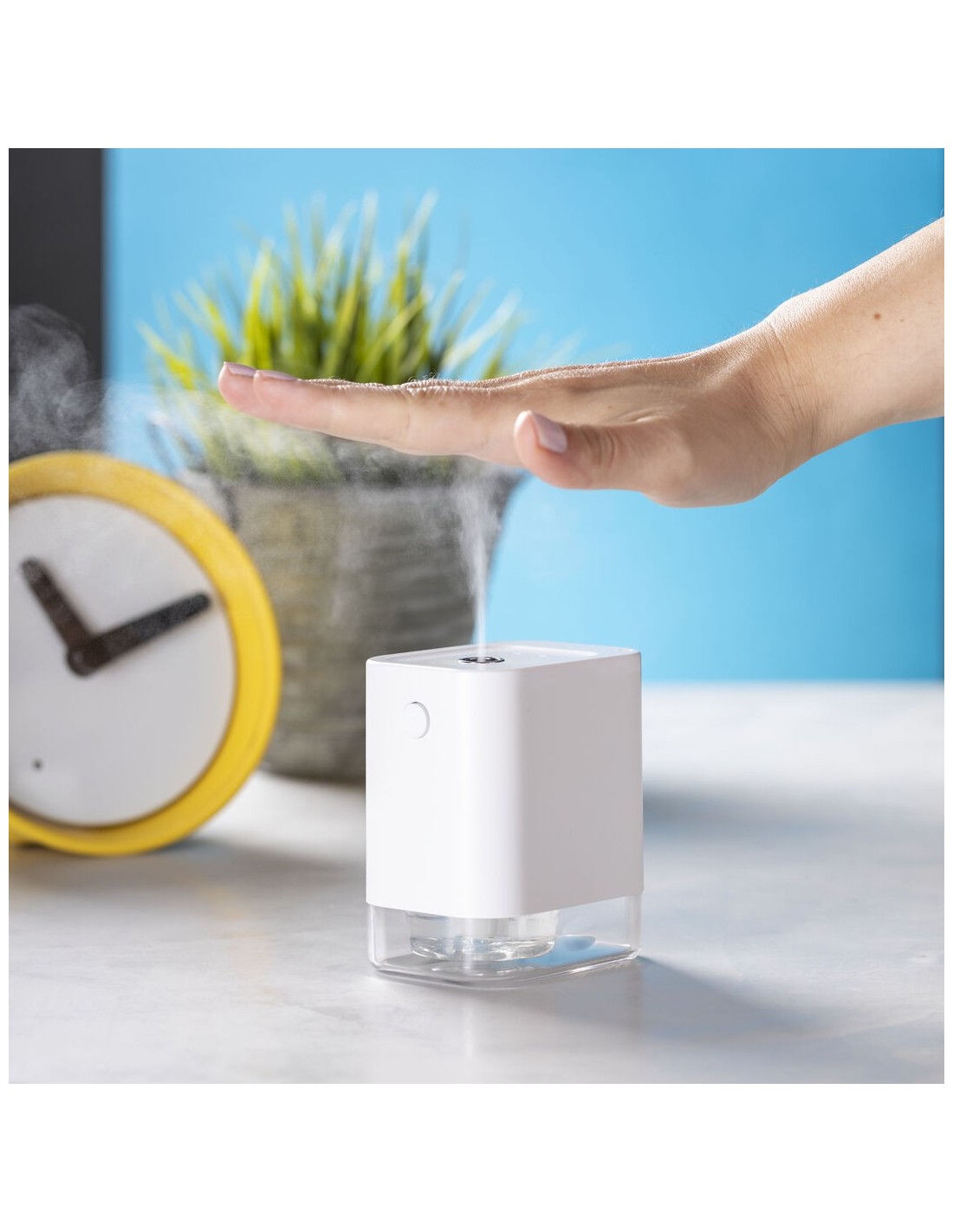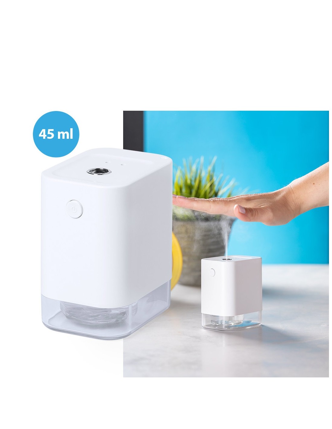 Dispensador automático de alcohol para higiene y limpieza de la piel, con sensor de movimiento de infrarrojos y led indicador. Tamaño compacto y discreto acabado en color blanco mate especialmente indicado para marcaje en tampografía, con depósito de 45 ml fácilmente rellenable (alcohol no incluido), más filtro y muelle de recambio. Batería de iones de litio de 1.800 mA y capacidad de conversión electrónica ≥ 90%. Recargable mediante cable USB tipo C de 1 metro de largo en color a juego,. Presentado en atractiva caja de diseño, disponible manual de instrucciones en español en inglés.