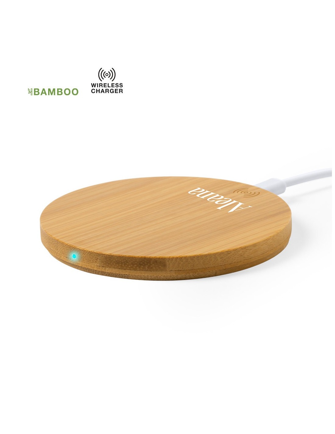 Cargador inalámbrico de línea nature y diseño circular. Carcasa en bambú procedente de cortes naturales. Indicador de estado de carga y compatible con dispositivos equipados con tecnología de carga inalámbrica. Amplia superficie de marcaje y presentado en atractiva caja de diseño eco.