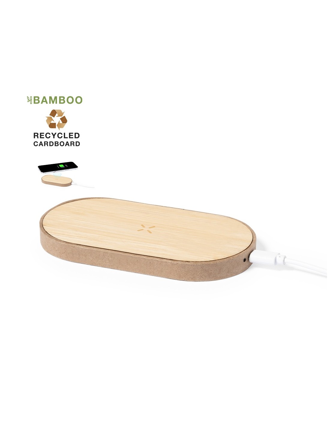 Cargador inalámbrico 10W de línea nature, con base fabricada en cartón reciclado y superficie de carga en bambú. Compatible con dispositivos equipados con tecnología de carga inalámbrica Qi. Con indicador LED de estado de carga y cable de carga Tipo C incluido. Base antideslizante y presentado en caja individual de diseño kraft, con manual de instrucciones en español e inglés. Fabricado conforme a los estándares RoHS y en cumplimiento con los siguientes requisitos de seguridad: Sistema de protección contra sobrecalentamiento. Sistema de protección contra sobrecarga. Sistema de bloqueo para evitar cortocircuitos.