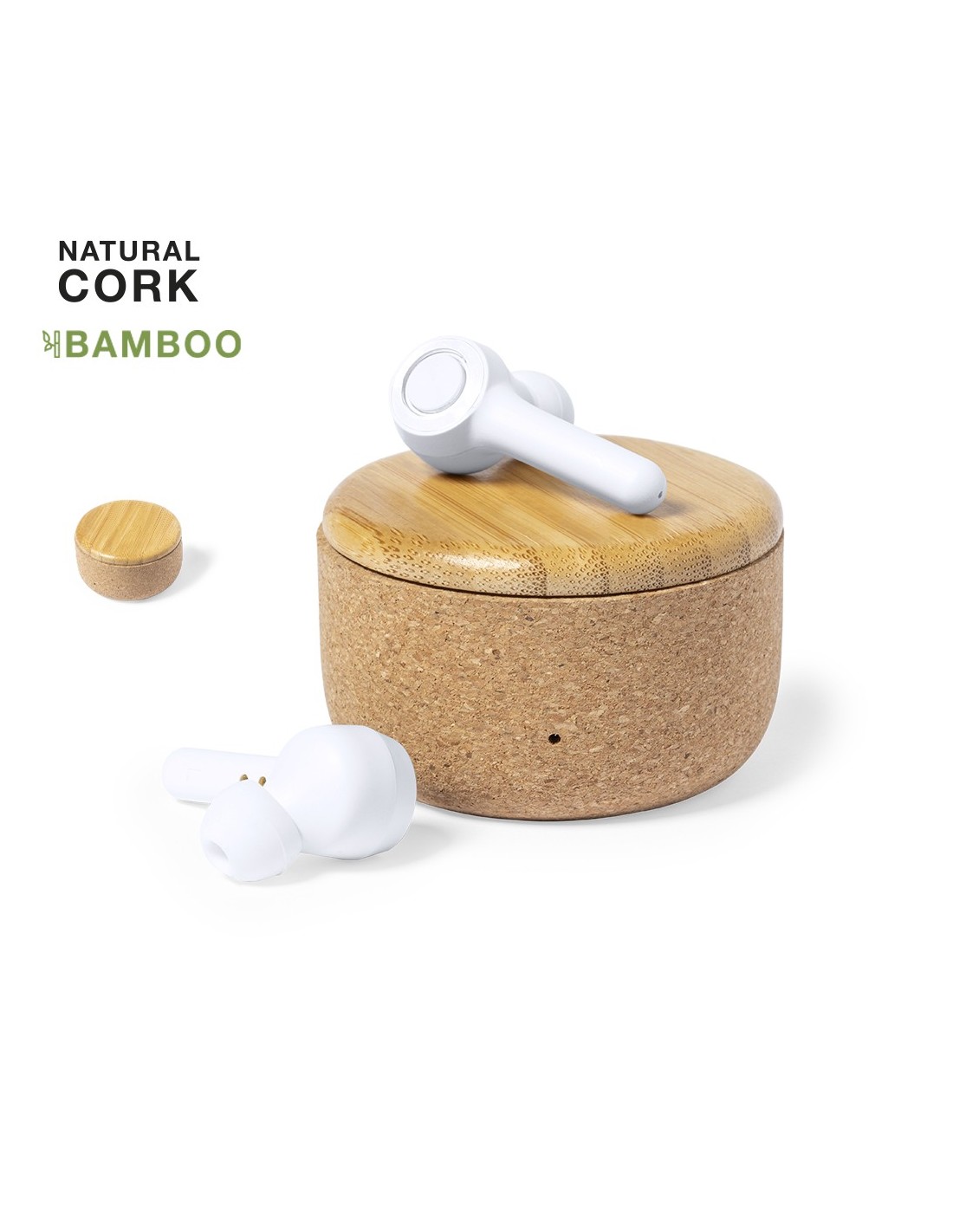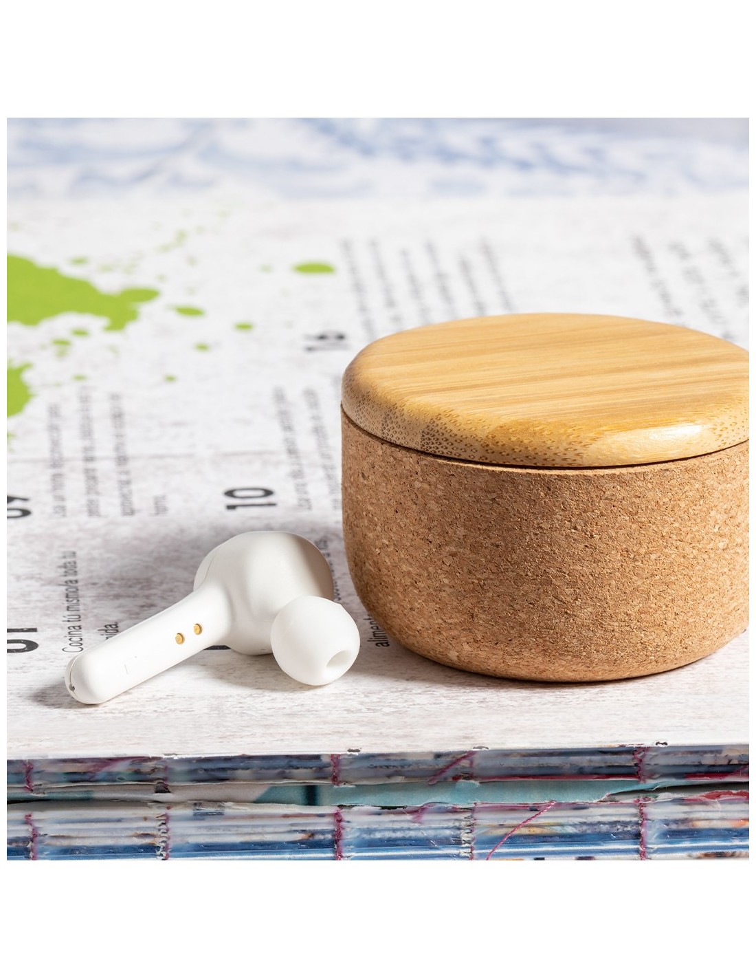 Auriculares intraurales de conexión Bluetooth® 5.0, con batería integrada de litio de 30 mAh en cada auricular y en elegante acabado de color blanco. De diseño ergonómico, incluyen botón de control táctil en el auricular y función manos libres. Base de carga en corcho natural con tapa en bambú. Base de 300 mAh de capacidad e indicador LED de estado de carga, con cable de carga Tipo C incluido. Presentación en caja individual de diseño kraft, con manual de instrucciones en español e inglés.