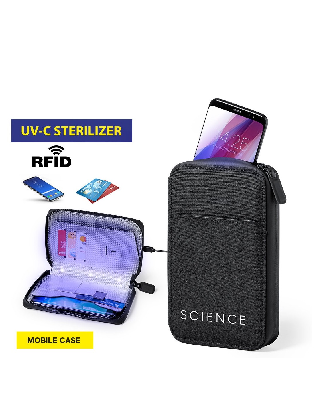 Organizador y esterilizador de luz ultravioleta tipo C, con protección RFID (Identificación por Radio Frecuencia) que mantiene seguros tus dispositivos de transmisión de identidad. Especialmente diseñado para la eliminación de microorganismos y bacterias en smartphones y otros objetos de uso cotidiano. Fabricada en resistente poliéster 600D de acabado denim, con cierre magnético de seguridad en tirador para un uso seguro del dispositivo. Incluye 4 tarjeteros interiores + bolsillo exterior. Presentado en atractiva caja individual de diseño. Potencia LED 1.2W y longitud de onda 275nm. Tiempo de esterilización con función auto-apagado de 1 y 3 minutos. Disponible manual de usuario en español e inglés. Disponible certificación CE, RoHS y de efectividad germicida. Para un uso adecuado del producto, evitar el contacto con la piel y los ojos.
